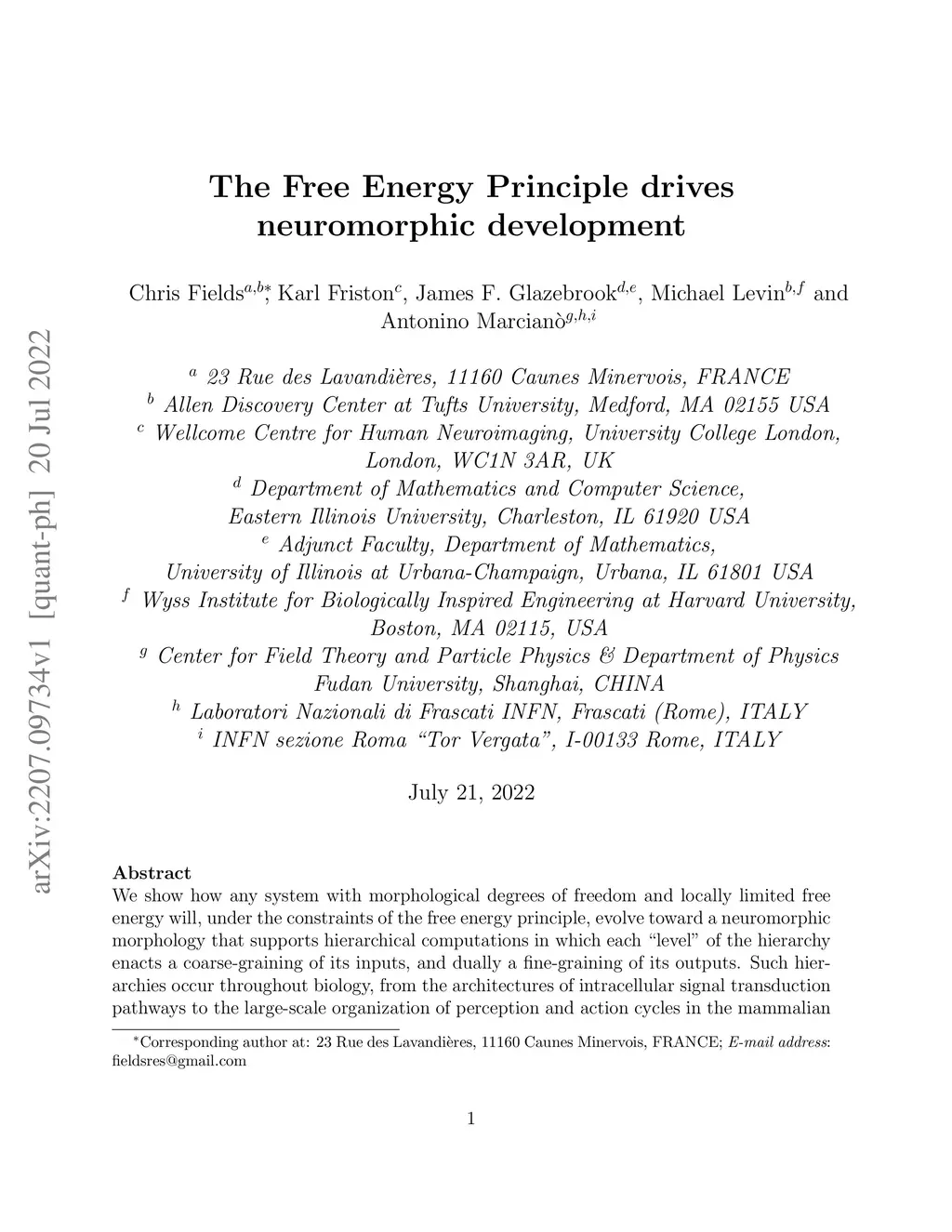 We show how any system with morphological degrees of freedom and locally limited free energy will, under the constraints of the free energy principle, evolve toward a neuromorphic morphology that supports hierarchical computations in which each level of the hierarchy enacts a coarse-graining of its inputs, and dually a fine-graining of its outputs. Such hierarchies occur throughout biology, from the architectures of intracellular signal transduction pathways to the large-scale organization of perception and action cycles in the mammalian brain. Formally, the close formal connections between cone-cocone diagrams (CCCD) as models of quantum reference frames on the one hand, and between CCCDs and topological quantum field theories on the other, allow the representation of such computations in the fully-general quantum-computational framework of topological quantum neural networks.