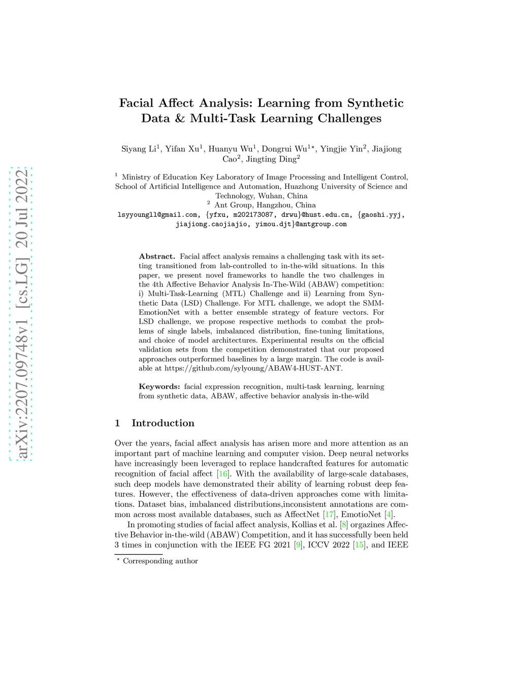 Facial affect analysis remains a challenging task with its setting transitioned from lab-controlled to in-the-wild situations. In this paper, we present novel frameworks to handle the two challenges in the 4th Affective Behavior Analysis In-The-Wild (ABAW) competition: i) Multi-Task-Learning (MTL) Challenge and ii) Learning from Synthetic Data (LSD) Challenge. For MTL challenge, we adopt the SMM-EmotionNet with a better ensemble strategy of feature vectors. For LSD challenge, we propose respective methods to combat the problems of single labels, imbalanced distribution, fine-tuning limitations, and choice of model architectures. Experimental results on the official validation sets from the competition demonstrated that our proposed approaches outperformed baselines by a large margin. The code is available at https://github.com/sylyoung/ABAW4-HUST-ANT.