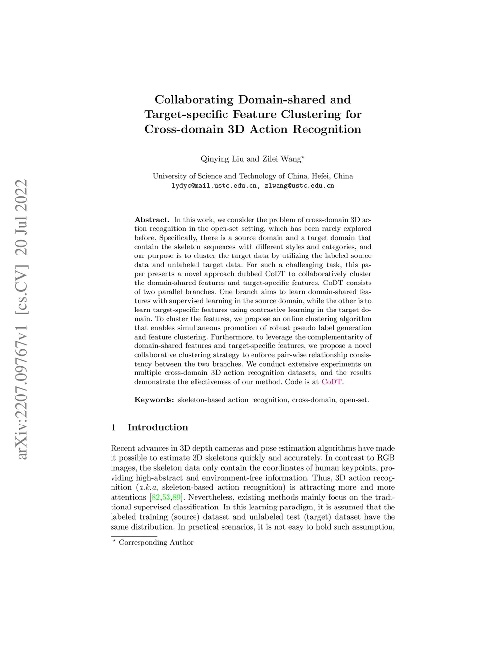 In this work, we consider the problem of cross-domain 3D action recognition in the open-set setting, which has been rarely explored before. Specifically, there is a source domain and a target domain that contain the skeleton sequences with different styles and categories, and our purpose is to cluster the target data by utilizing the labeled source data and unlabeled target data. For such a challenging task, this paper presents a novel approach dubbed CoDT to collaboratively cluster the domain-shared features and target-specific features. CoDT consists of two parallel branches. One branch aims to learn domain-shared features with supervised learning in the source domain, while the other is to learn target-specific features using contrastive learning in the target domain. To cluster the features, we propose an online clustering algorithm that enables simultaneous promotion of robust pseudo label generation and feature clustering. Furthermore, to leverage the complementarity of domain-shared features and target-specific features, we propose a novel collaborative clustering strategy to enforce pair-wise relationship consistency between the two branches. We conduct extensive experiments on multiple cross-domain 3D action recognition datasets, and the results demonstrate the effectiveness of our method.