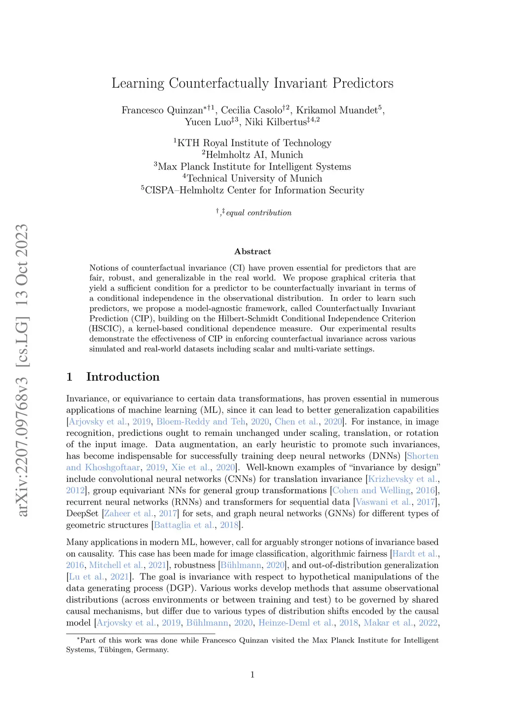 Notions of counterfactual invariance (CI) have proven essential for predictors that are fair, robust, and generalizable in the real world. We propose graphical criteria that yield a sufficient condition for a predictor to be counterfactually invariant in terms of a conditional independence in the observational distribution. In order to learn such predictors, we propose a model-agnostic framework, called Counterfactually Invariant Prediction (CIP), building on the Hilbert-Schmidt Conditional Independence Criterion (HSCIC), a kernel-based conditional dependence measure. Our experimental results demonstrate the effectiveness of CIP in enforcing counterfactual invariance across various simulated and real-world datasets including scalar and multi-variate settings.