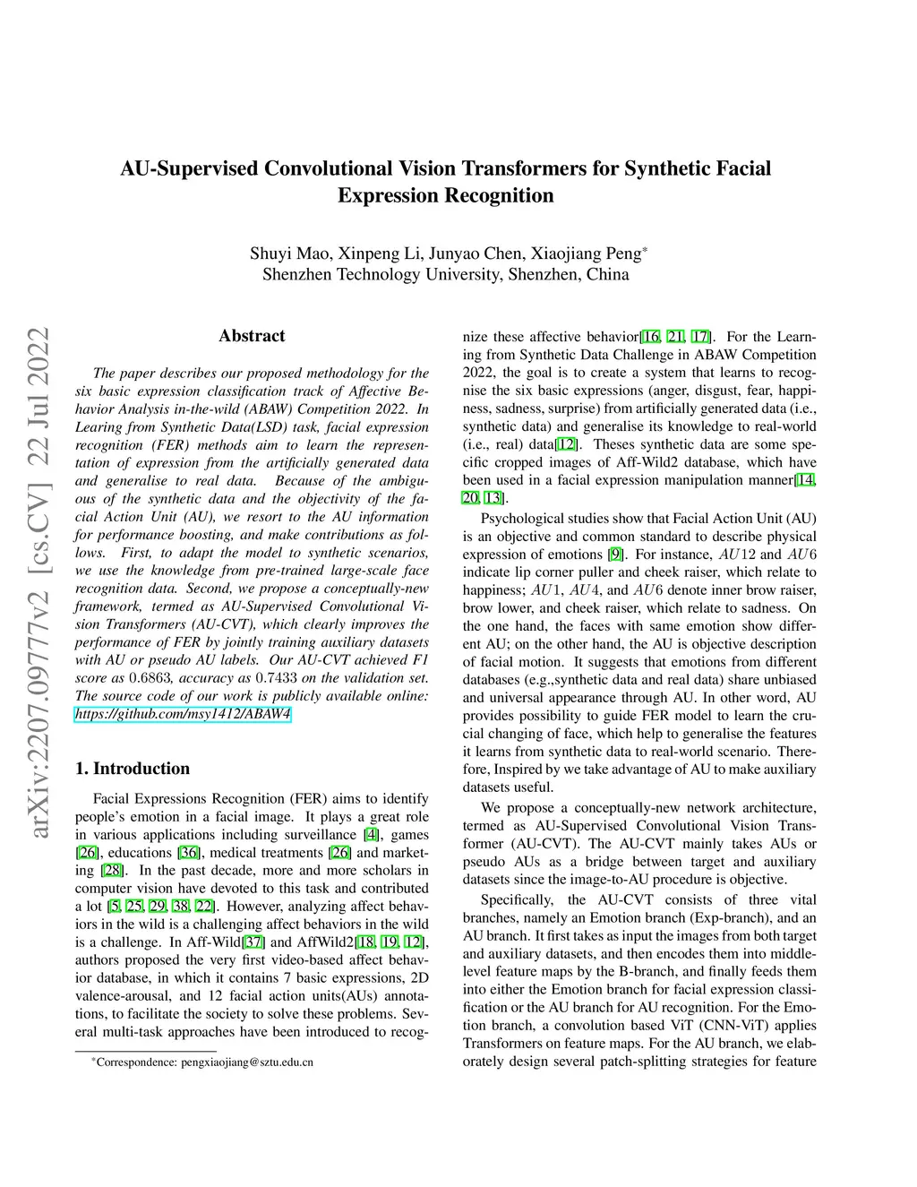 The paper describes our proposed methodology for the six basic expression classification track of Affective Behavior Analysis in-the-wild (ABAW) Competition 2022. In Learing from Synthetic Data(LSD) task, facial expression recognition (FER) methods aim to learn the representation of expression from the artificially generated data and generalise to real data. Because of the ambiguous of the synthetic data and the objectivity of the facial Action Unit (AU), we resort to the AU information for performance boosting, and make contributions as follows. First, to adapt the model to synthetic scenarios, we use the knowledge from pre-trained large-scale face recognition data. Second, we propose a conceptually-new framework, termed as AU-Supervised Convolutional Vision Transformers (AU-CVT), which clearly improves the performance of FER by jointly training auxiliary datasets with AU or pseudo AU labels. Our AU-CVT achieved F1 score as , accuracy as on the validation set. The source code of our work is publicly available online: https://github.com/msy1412/ABAW4