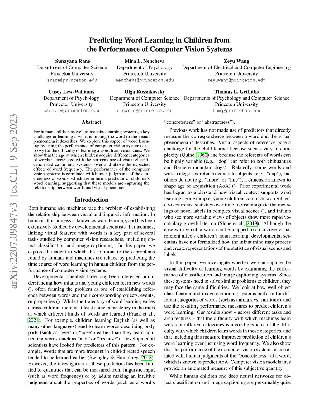 For human children as well as machine learning systems, a key challenge in learning a word is linking the word to the visual phenomena it describes. We explore this aspect of word learning by using the performance of computer vision systems as a proxy for the difficulty of learning a word from visual cues. We show that the age at which children acquire different categories of words is correlated with the performance of visual classification and captioning systems, over and above the expected effects of word frequency. The performance of the computer vision systems is correlated with human judgments of the concreteness of words, which are in turn a predictor of children's word learning, suggesting that these models are capturing the relationship between words and visual phenomena.