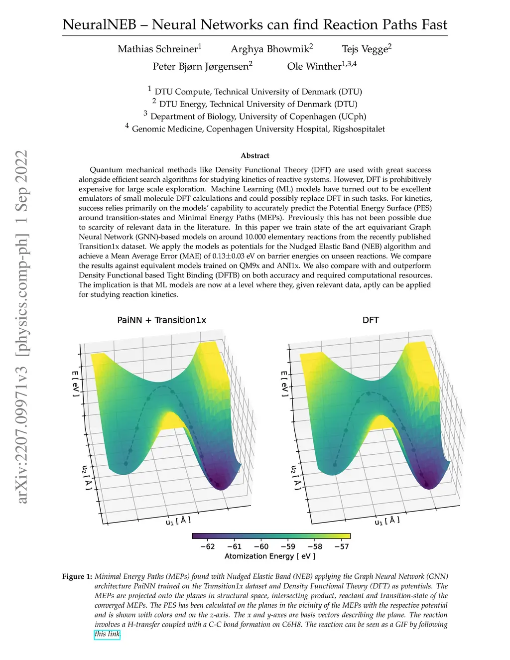 Quantum mechanical methods like Density Functional Theory (DFT) are used with great success alongside efficient search algorithms for studying kinetics of reactive systems. However, DFT is prohibitively expensive for large scale exploration. Machine Learning (ML) models have turned out to be excellent emulators of small molecule DFT calculations and could possibly replace DFT in such tasks. For kinetics, success relies primarily on the models capability to accurately predict the Potential Energy Surface (PES) around transition-states and Minimal Energy Paths (MEPs). Previously this has not been possible due to scarcity of relevant data in the literature. In this paper we train state of the art equivariant Graph Neural Network (GNN)-based models on around 10.000 elementary reactions from the Transition1x dataset. We apply the models as potentials for the Nudged Elastic Band (NEB) algorithm and achieve a Mean Average Error (MAE) of 0.13+/-0.03 eV on barrier energies on unseen reactions. We compare the results against equivalent models trained on QM9 and ANI1x. We also compare with and outperform Density Functional based Tight Binding (DFTB) on both accuracy and computational resource. The implication is that ML models, given relevant data, are now at a level where they can be applied for downstream tasks in quantum chemistry transcending prediction of simple molecular features.