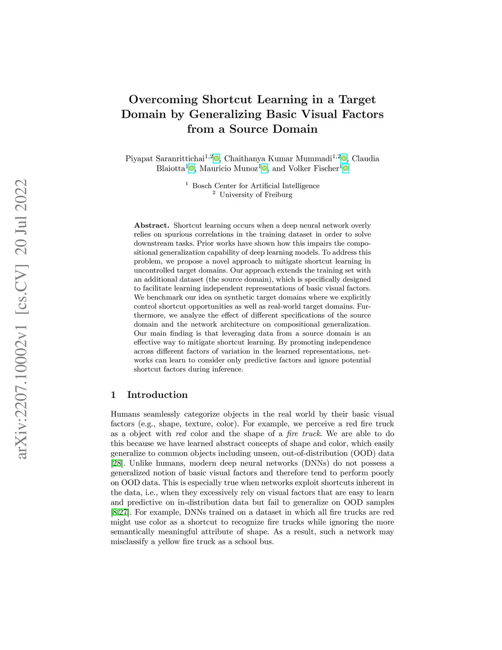 Shortcut learning occurs when a deep neural network overly relies on spurious correlations in the training dataset in order to solve downstream tasks. Prior works have shown how this impairs the compositional generalization capability of deep learning models. To address this problem, we propose a novel approach to mitigate shortcut learning in uncontrolled target domains. Our approach extends the training set with an additional dataset (the source domain), which is specifically designed to facilitate learning independent representations of basic visual factors. We benchmark our idea on synthetic target domains where we explicitly control shortcut opportunities as well as real-world target domains. Furthermore, we analyze the effect of different specifications of the source domain and the network architecture on compositional generalization. Our main finding is that leveraging data from a source domain is an effective way to mitigate shortcut learning. By promoting independence across different factors of variation in the learned representations, networks can learn to consider only predictive factors and ignore potential shortcut factors during inference.