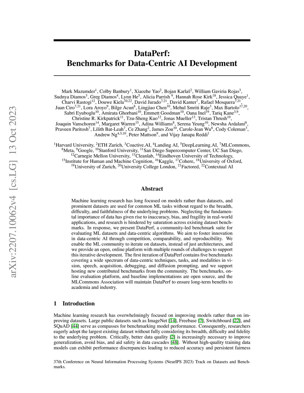 Machine learning research has long focused on models rather than datasets, and prominent datasets are used for common ML tasks without regard to the breadth, difficulty, and faithfulness of the underlying problems. Neglecting the fundamental importance of data has given rise to inaccuracy, bias, and fragility in real-world applications, and research is hindered by saturation across existing dataset benchmarks. In response, we present DataPerf, a community-led benchmark suite for evaluating ML datasets and data-centric algorithms. We aim to foster innovation in data-centric AI through competition, comparability, and reproducibility. We enable the ML community to iterate on datasets, instead of just architectures, and we provide an open, online platform with multiple rounds of challenges to support this iterative development. The first iteration of DataPerf contains five benchmarks covering a wide spectrum of data-centric techniques, tasks, and modalities in vision, speech, acquisition, debugging, and diffusion prompting, and we support hosting new contributed benchmarks from the community. The benchmarks, online evaluation platform, and baseline implementations are open source, and the MLCommons Association will maintain DataPerf to ensure long-term benefits to academia and industry.