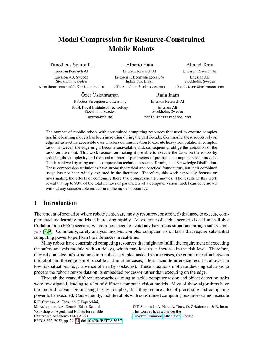 The number of mobile robots with constrained computing resources that need to execute complex machine learning models has been increasing during the past decade. Commonly, these robots rely on edge infrastructure accessible over wireless communication to execute heavy computational complex tasks. However, the edge might become unavailable and, consequently, oblige the execution of the tasks on the robot. This work focuses on making it possible to execute the tasks on the robots by reducing the complexity and the total number of parameters of pre-trained computer vision models. This is achieved by using model compression techniques such as Pruning and Knowledge Distillation. These compression techniques have strong theoretical and practical foundations, but their combined usage has not been widely explored in the literature. Therefore, this work especially focuses on investigating the effects of combining these two compression techniques. The results of this work reveal that up to 90% of the total number of parameters of a computer vision model can be removed without any considerable reduction in the model's accuracy.