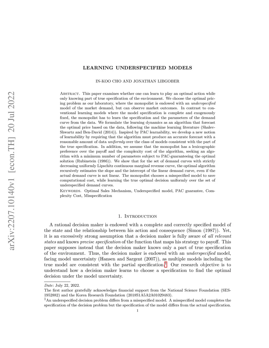 This paper examines whether one can learn to play an optimal action while only knowing part of true specification of the environment. We choose the optimal pricing problem as our laboratory, where the monopolist is endowed with an underspecified model of the market demand, but can observe market outcomes. In contrast to conventional learning models where the model specification is complete and exogenously fixed, the monopolist has to learn the specification and the parameters of the demand curve from the data. We formulate the learning dynamics as an algorithm that forecast the optimal price based on the data, following the machine learning literature (Shalev-Shwartz and Ben-David (2014)). Inspired by PAC learnability, we develop a new notion of learnability by requiring that the algorithm must produce an accurate forecast with a reasonable amount of data uniformly over the class of models consistent with the part of the true specification. In addition, we assume that the monopolist has a lexicographic preference over the payoff and the complexity cost of the algorithm, seeking an algorithm with a minimum number of parameters subject to PAC-guaranteeing the optimal solution (Rubinstein (1986)). We show that for the set of demand curves with strictly decreasing uniformly Lipschitz continuous marginal revenue curve, the optimal algorithm recursively estimates the slope and the intercept of the linear demand curve, even if the actual demand curve is not linear. The monopolist chooses a misspecified model to save computational cost, while learning the true optimal decision uniformly over the set of underspecified demand curves.