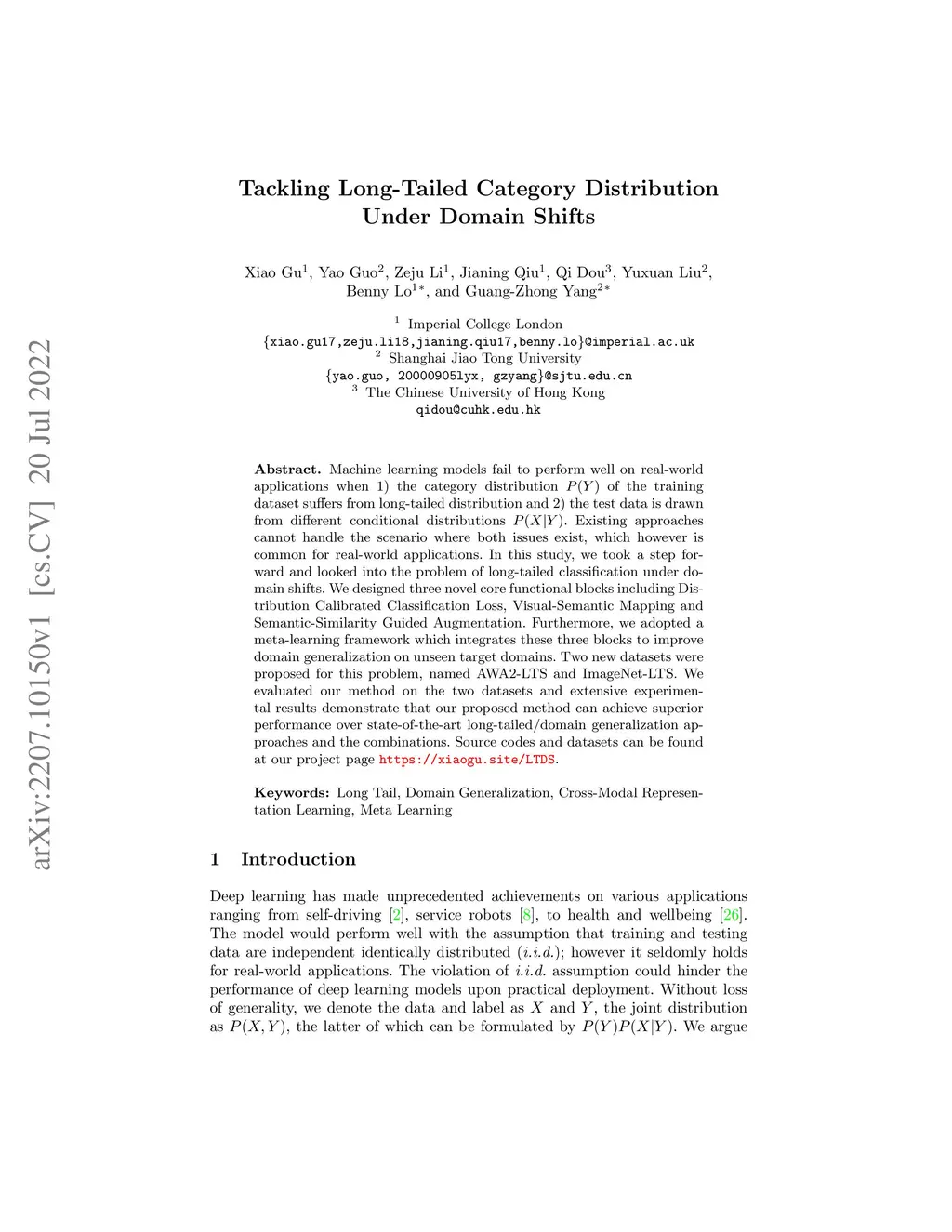 Machine learning models fail to perform well on real-world applications when 1) the category distribution P(Y) of the training dataset suffers from long-tailed distribution and 2) the test data is drawn from different conditional distributions P(X|Y). Existing approaches cannot handle the scenario where both issues exist, which however is common for real-world applications. In this study, we took a step forward and looked into the problem of long-tailed classification under domain shifts. We designed three novel core functional blocks including Distribution Calibrated Classification Loss, Visual-Semantic Mapping and Semantic-Similarity Guided Augmentation. Furthermore, we adopted a meta-learning framework which integrates these three blocks to improve domain generalization on unseen target domains. Two new datasets were proposed for this problem, named AWA2-LTS and ImageNet-LTS. We evaluated our method on the two datasets and extensive experimental results demonstrate that our proposed method can achieve superior performance over state-of-the-art long-tailed/domain generalization approaches and the combinations. Source codes and datasets can be found at our project page https://xiaogu.site/LTDS.
