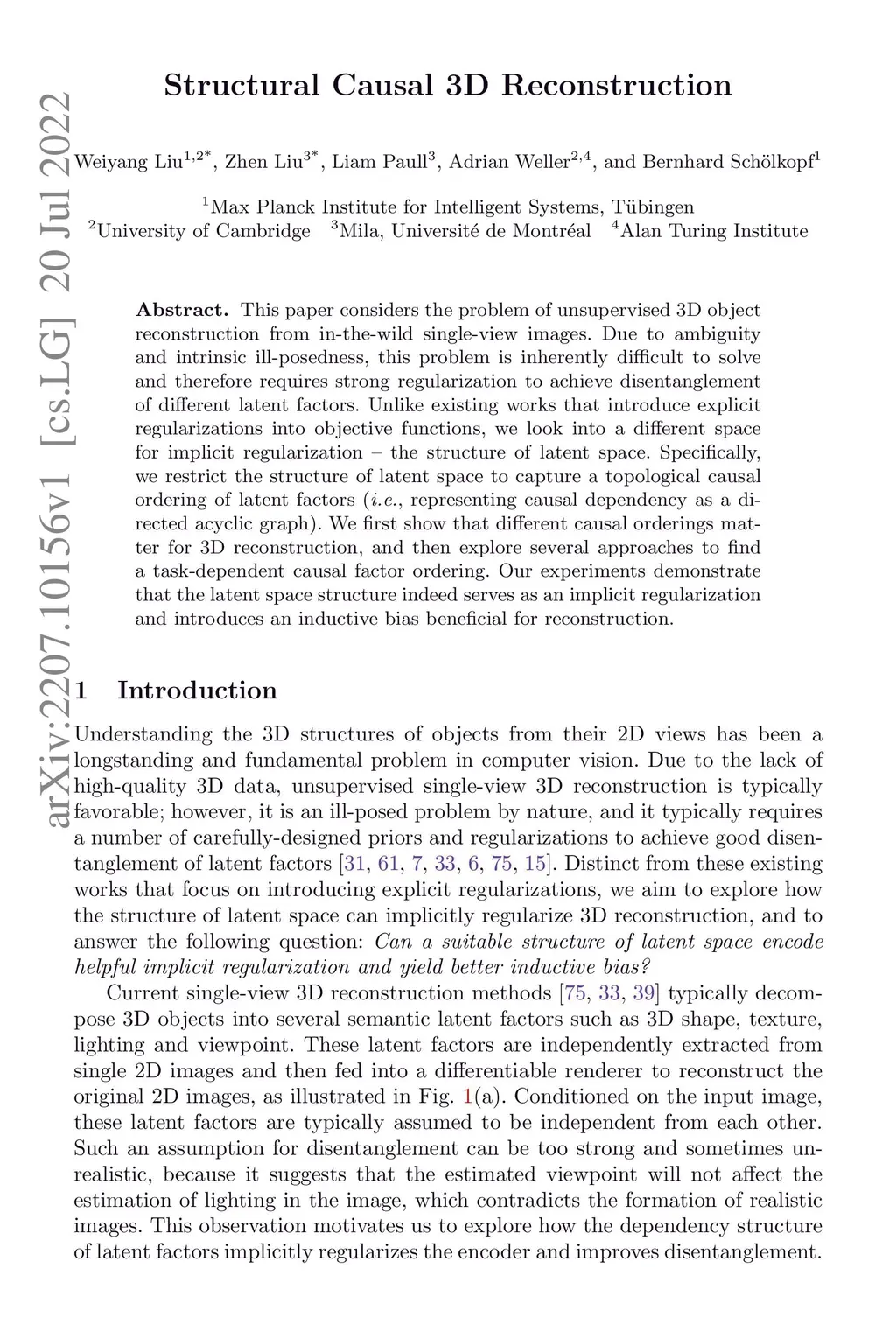 This paper considers the problem of unsupervised 3D object reconstruction from in-the-wild single-view images. Due to ambiguity and intrinsic ill-posedness, this problem is inherently difficult to solve and therefore requires strong regularization to achieve disentanglement of different latent factors. Unlike existing works that introduce explicit regularizations into objective functions, we look into a different space for implicit regularization -- the structure of latent space. Specifically, we restrict the structure of latent space to capture a topological causal ordering of latent factors (i.e., representing causal dependency as a directed acyclic graph). We first show that different causal orderings matter for 3D reconstruction, and then explore several approaches to find a task-dependent causal factor ordering. Our experiments demonstrate that the latent space structure indeed serves as an implicit regularization and introduces an inductive bias beneficial for reconstruction.