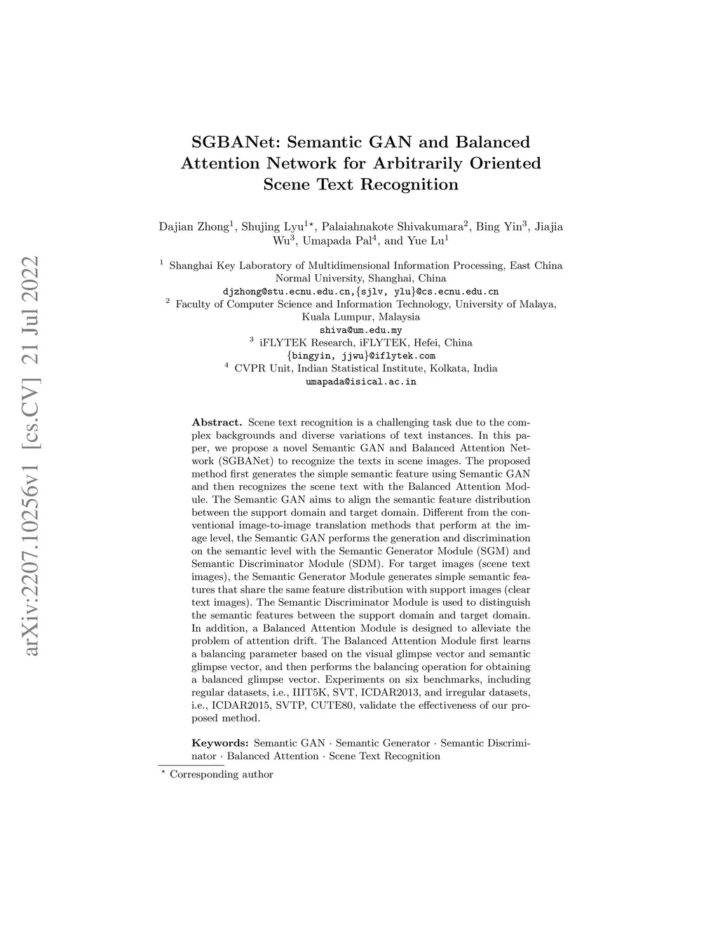 Scene text recognition is a challenging task due to the complex backgrounds and diverse variations of text instances. In this paper, we propose a novel Semantic GAN and Balanced Attention Network (SGBANet) to recognize the texts in scene images. The proposed method first generates the simple semantic feature using Semantic GAN and then recognizes the scene text with the Balanced Attention Module. The Semantic GAN aims to align the semantic feature distribution between the support domain and target domain. Different from the conventional image-to-image translation methods that perform at the image level, the Semantic GAN performs the generation and discrimination on the semantic level with the Semantic Generator Module (SGM) and Semantic Discriminator Module (SDM). For target images (scene text images), the Semantic Generator Module generates simple semantic features that share the same feature distribution with support images (clear text images). The Semantic Discriminator Module is used to distinguish the semantic features between the support domain and target domain. In addition, a Balanced Attention Module is designed to alleviate the problem of attention drift. The Balanced Attention Module first learns a balancing parameter based on the visual glimpse vector and semantic glimpse vector, and then performs the balancing operation for obtaining a balanced glimpse vector. Experiments on six benchmarks, including regular datasets, i.e., IIIT5K, SVT, ICDAR2013, and irregular datasets, i.e., ICDAR2015, SVTP, CUTE80, validate the effectiveness of our proposed method.