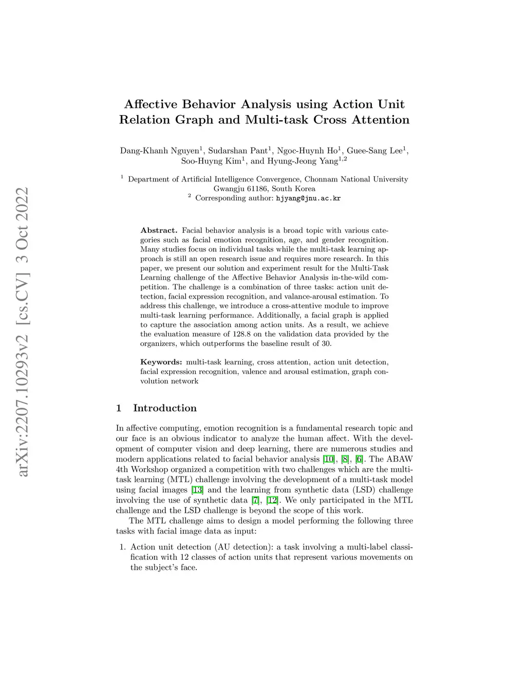 Facial behavior analysis is a broad topic with various categories such as facial emotion recognition, age, and gender recognition. Many studies focus on individual tasks while the multi-task learning approach is still an open research issue and requires more research. In this paper, we present our solution and experiment result for the Multi-Task Learning challenge of the Affective Behavior Analysis in-the-wild competition. The challenge is a combination of three tasks: action unit detection, facial expression recognition, and valance-arousal estimation. To address this challenge, we introduce a cross-attentive module to improve multi-task learning performance. Additionally, a facial graph is applied to capture the association among action units. As a result, we achieve the evaluation measure of 128.8 on the validation data provided by the organizers, which outperforms the baseline result of 30.