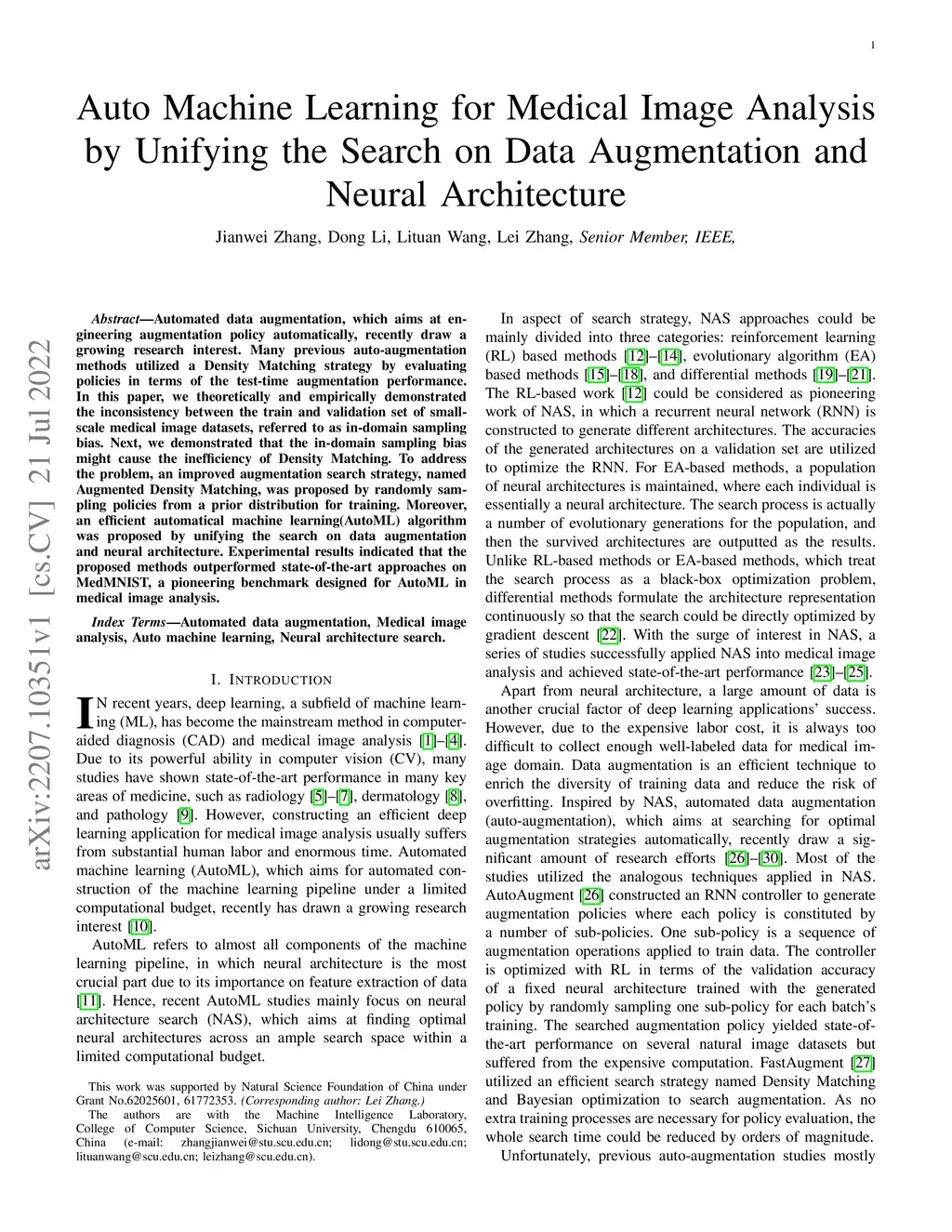 Automated data augmentation, which aims at engineering augmentation policy automatically, recently draw a growing research interest. Many previous auto-augmentation methods utilized a Density Matching strategy by evaluating policies in terms of the test-time augmentation performance. In this paper, we theoretically and empirically demonstrated the inconsistency between the train and validation set of small-scale medical image datasets, referred to as in-domain sampling bias. Next, we demonstrated that the in-domain sampling bias might cause the inefficiency of Density Matching. To address the problem, an improved augmentation search strategy, named Augmented Density Matching, was proposed by randomly sampling policies from a prior distribution for training. Moreover, an efficient automatical machine learning(AutoML) algorithm was proposed by unifying the search on data augmentation and neural architecture. Experimental results indicated that the proposed methods outperformed state-of-the-art approaches on MedMNIST, a pioneering benchmark designed for AutoML in medical image analysis.