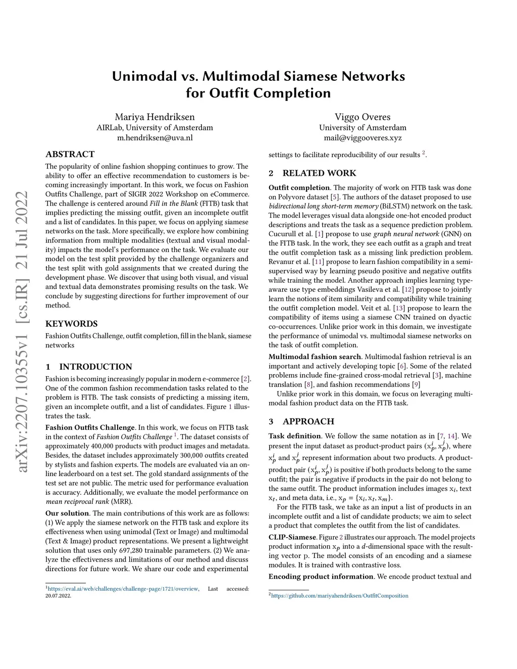 The popularity of online fashion shopping continues to grow. The ability to offer an effective recommendation to customers is becoming increasingly important. In this work, we focus on Fashion Outfits Challenge, part of SIGIR 2022 Workshop on eCommerce. The challenge is centered around Fill in the Blank (FITB) task that implies predicting the missing outfit, given an incomplete outfit and a list of candidates. In this paper, we focus on applying siamese networks on the task. More specifically, we explore how combining information from multiple modalities (textual and visual modality) impacts the performance of the model on the task. We evaluate our model on the test split provided by the challenge organizers and the test split with gold assignments that we created during the development phase. We discover that using both visual, and visual and textual data demonstrates promising results on the task. We conclude by suggesting directions for further improvement of our method.