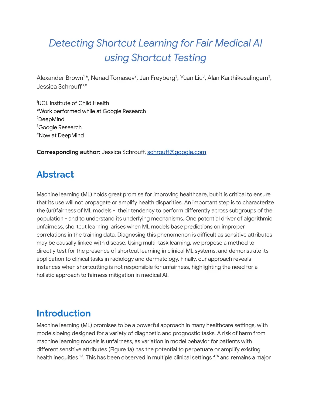 Machine learning (ML) holds great promise for improving healthcare, but it is critical to ensure that its use will not propagate or amplify health disparities. An important step is to characterize the (un)fairness of ML models - their tendency to perform differently across subgroups of the population - and to understand its underlying mechanisms. One potential driver of algorithmic unfairness, shortcut learning, arises when ML models base predictions on improper correlations in the training data. However, diagnosing this phenomenon is difficult, especially when sensitive attributes are causally linked with disease. Using multi-task learning, we propose the first method to assess and mitigate shortcut learning as a part of the fairness assessment of clinical ML systems, and demonstrate its application to clinical tasks in radiology and dermatology. Finally, our approach reveals instances when shortcutting is not responsible for unfairness, highlighting the need for a holistic approach to fairness mitigation in medical AI.