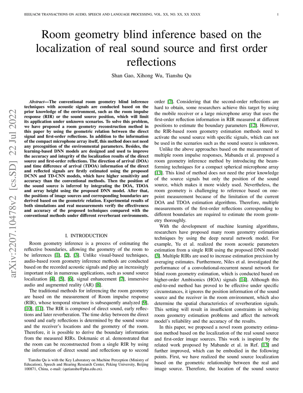 The conventional room geometry blind inference techniques with acoustic signals are conducted based on the prior knowledge of the environment, such as the room impulse response (RIR) or the sound source position, which will limit its application under known scenarios. To solve this problem, we have proposed a room geometry reconstruction method in this paper by using the geometric relation between the direct signal and first-order reflections. In addition to the information of the compact microphone array itself, this method does not need any precognition of the environmental parameters. Besides, the learning-based DNN models are designed and used to improve the accuracy and integrity of the localization results of the direct source and first-order reflections. The direction of arrival (DOA) and time difference of arrival (TDOA) information of the direct and reflected signals are firstly estimated using the proposed DCNN and TD-CNN models, which have higher sensitivity and accuracy than the conventional methods. Then the position of the sound source is inferred by integrating the DOA, TDOA and array height using the proposed DNN model. After that, the positions of image sources and corresponding boundaries are derived based on the geometric relation. Experimental results of both simulations and real measurements verify the effectiveness and accuracy of the proposed techniques compared with the conventional methods under different reverberant environments.