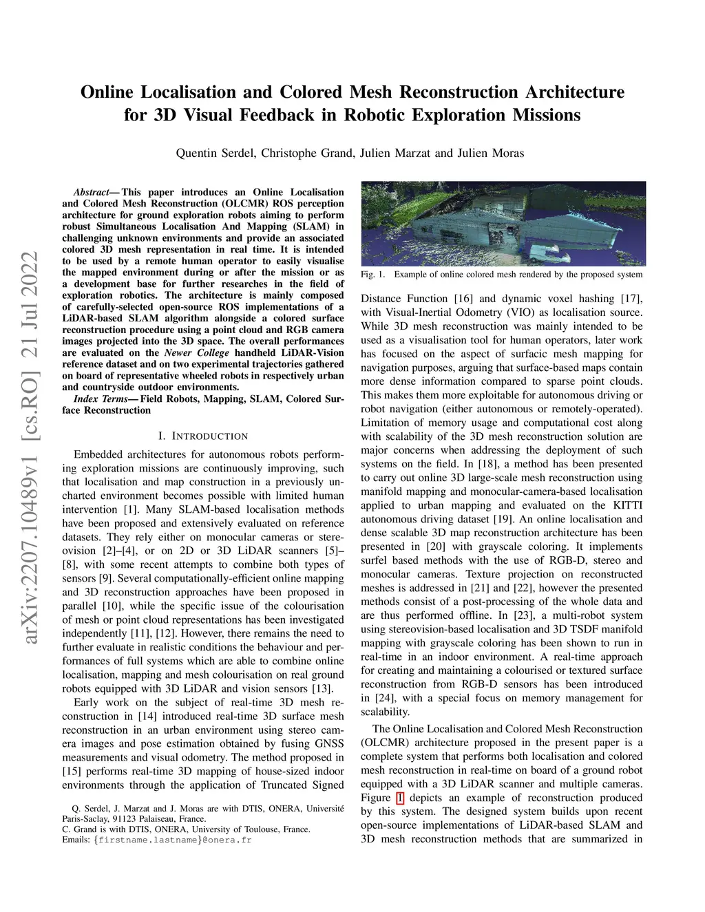 This paper introduces an Online Localisation and Colored Mesh Reconstruction (OLCMR) ROS perception architecture for ground exploration robots aiming to perform robust Simultaneous Localisation And Mapping (SLAM) in challenging unknown environments and provide an associated colored 3D mesh representation in real time. It is intended to be used by a remote human operator to easily visualise the mapped environment during or after the mission or as a development base for further researches in the field of exploration robotics. The architecture is mainly composed of carefully-selected open-source ROS implementations of a LiDAR-based SLAM algorithm alongside a colored surface reconstruction procedure using a point cloud and RGB camera images projected into the 3D space. The overall performances are evaluated on the Newer College handheld LiDAR-Vision reference dataset and on two experimental trajectories gathered on board of representative wheeled robots in respectively urban and countryside outdoor environments. Index Terms: Field Robots, Mapping, SLAM, Colored Surface Reconstruction