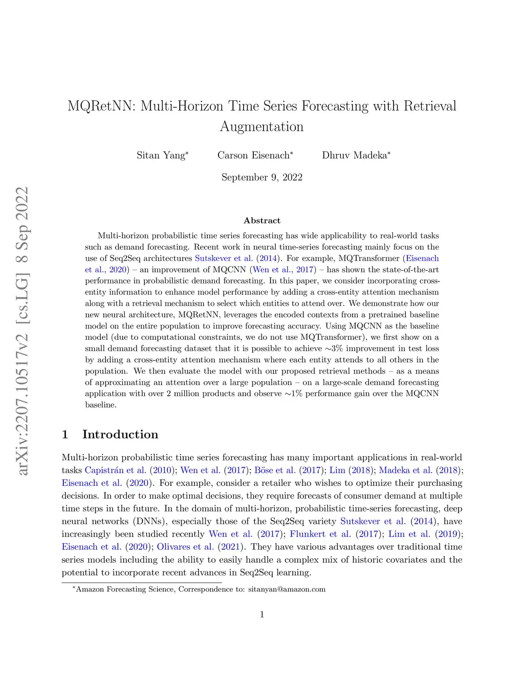 Multi-horizon probabilistic time series forecasting has wide applicability to real-world tasks such as demand forecasting. Recent work in neural time-series forecasting mainly focus on the use of Seq2Seq architectures. For example, MQTransformer - an improvement of MQCNN - has shown the state-of-the-art performance in probabilistic demand forecasting. In this paper, we consider incorporating cross-entity information to enhance model performance by adding a cross-entity attention mechanism along with a retrieval mechanism to select which entities to attend over. We demonstrate how our new neural architecture, MQRetNN, leverages the encoded contexts from a pretrained baseline model on the entire population to improve forecasting accuracy. Using MQCNN as the baseline model (due to computational constraints, we do not use MQTransformer), we first show on a small demand forecasting dataset that it is possible to achieve ~3% improvement in test loss by adding a cross-entity attention mechanism where each entity attends to all others in the population. We then evaluate the model with our proposed retrieval methods - as a means of approximating an attention over a large population - on a large-scale demand forecasting application with over 2 million products and observe ~1% performance gain over the MQCNN baseline.