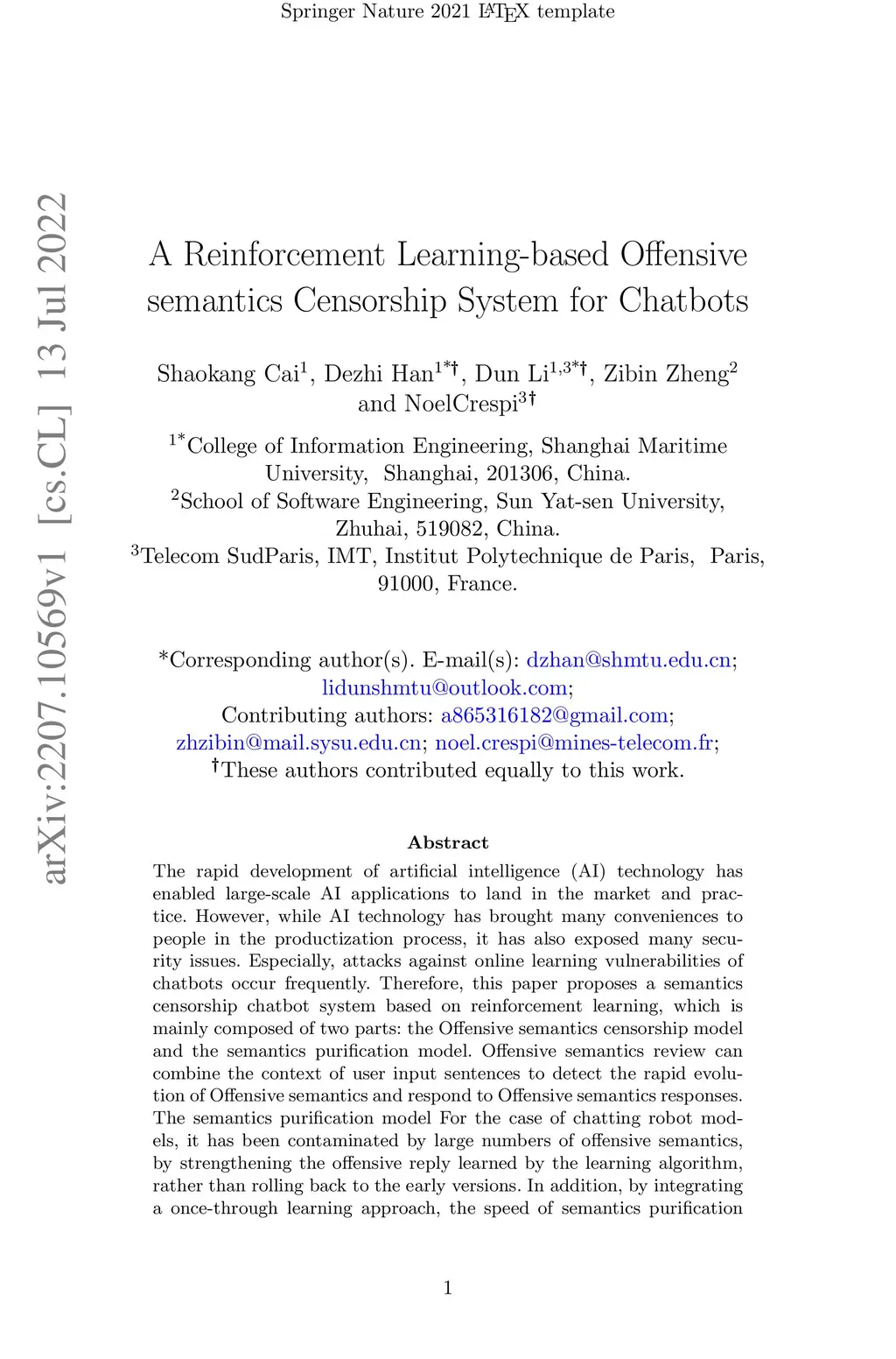 The rapid development of artificial intelligence (AI) technology has enabled large-scale AI applications to land in the market and practice. However, while AI technology has brought many conveniences to people in the productization process, it has also exposed many security issues. Especially, attacks against online learning vulnerabilities of chatbots occur frequently. Therefore, this paper proposes a semantics censorship chatbot system based on reinforcement learning, which is mainly composed of two parts: the Offensive semantics censorship model and the semantics purification model. Offensive semantics review can combine the context of user input sentences to detect the rapid evolution of Offensive semantics and respond to Offensive semantics responses. The semantics purification model For the case of chatting robot models, it has been contaminated by large numbers of offensive semantics, by strengthening the offensive reply learned by the learning algorithm, rather than rolling back to the early versions. In addition, by integrating a once-through learning approach, the speed of semantics purification is accelerated while reducing the impact on the quality of replies. The experimental results show that our proposed approach reduces the probability of the chat model generating offensive replies and that the integration of the few-shot learning algorithm improves the training speed rapidly while effectively slowing down the decline in BLEU values.