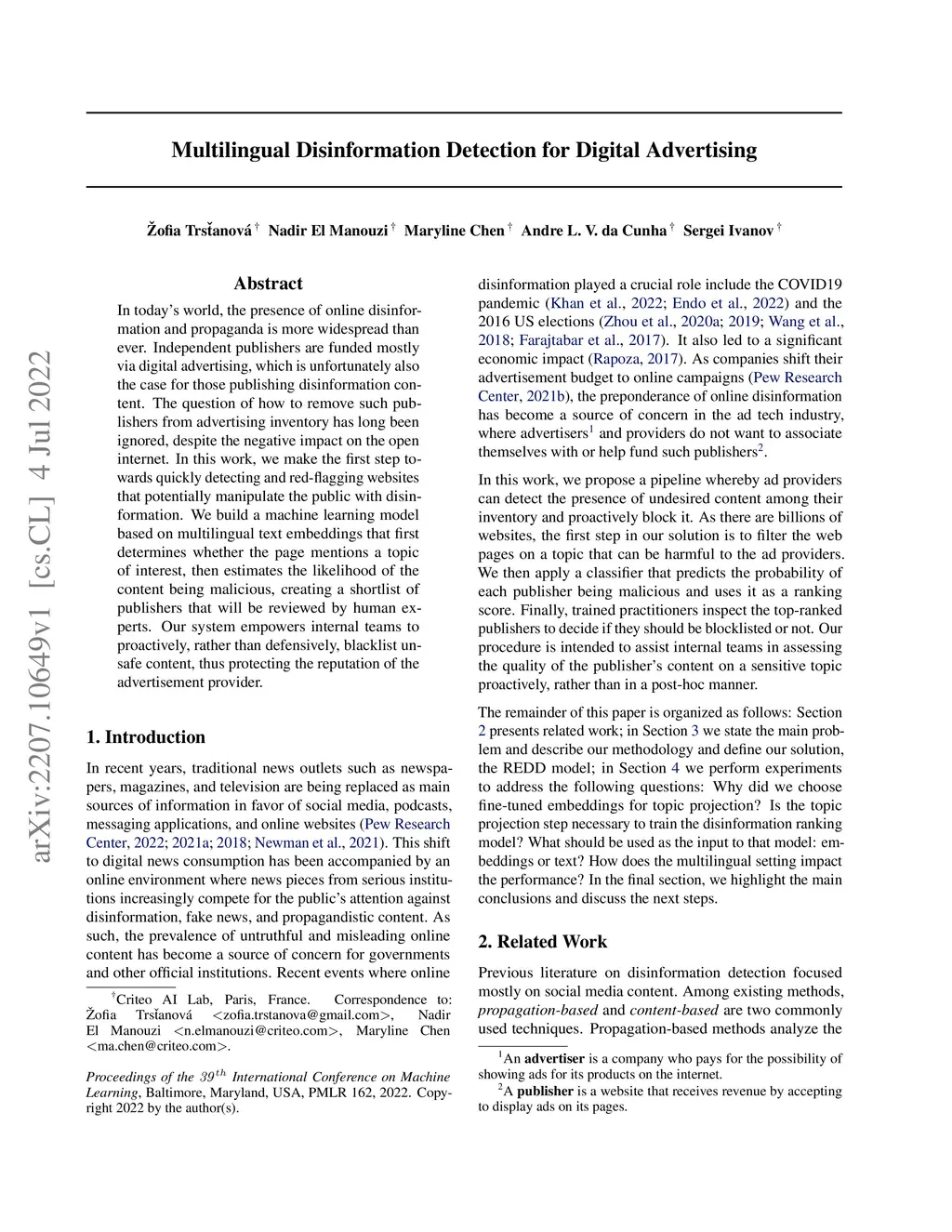 In today's world, the presence of online disinformation and propaganda is more widespread than ever. Independent publishers are funded mostly via digital advertising, which is unfortunately also the case for those publishing disinformation content. The question of how to remove such publishers from advertising inventory has long been ignored, despite the negative impact on the open internet. In this work, we make the first step towards quickly detecting and red-flagging websites that potentially manipulate the public with disinformation. We build a machine learning model based on multilingual text embeddings that first determines whether the page mentions a topic of interest, then estimates the likelihood of the content being malicious, creating a shortlist of publishers that will be reviewed by human experts. Our system empowers internal teams to proactively, rather than defensively, blacklist unsafe content, thus protecting the reputation of the advertisement provider.