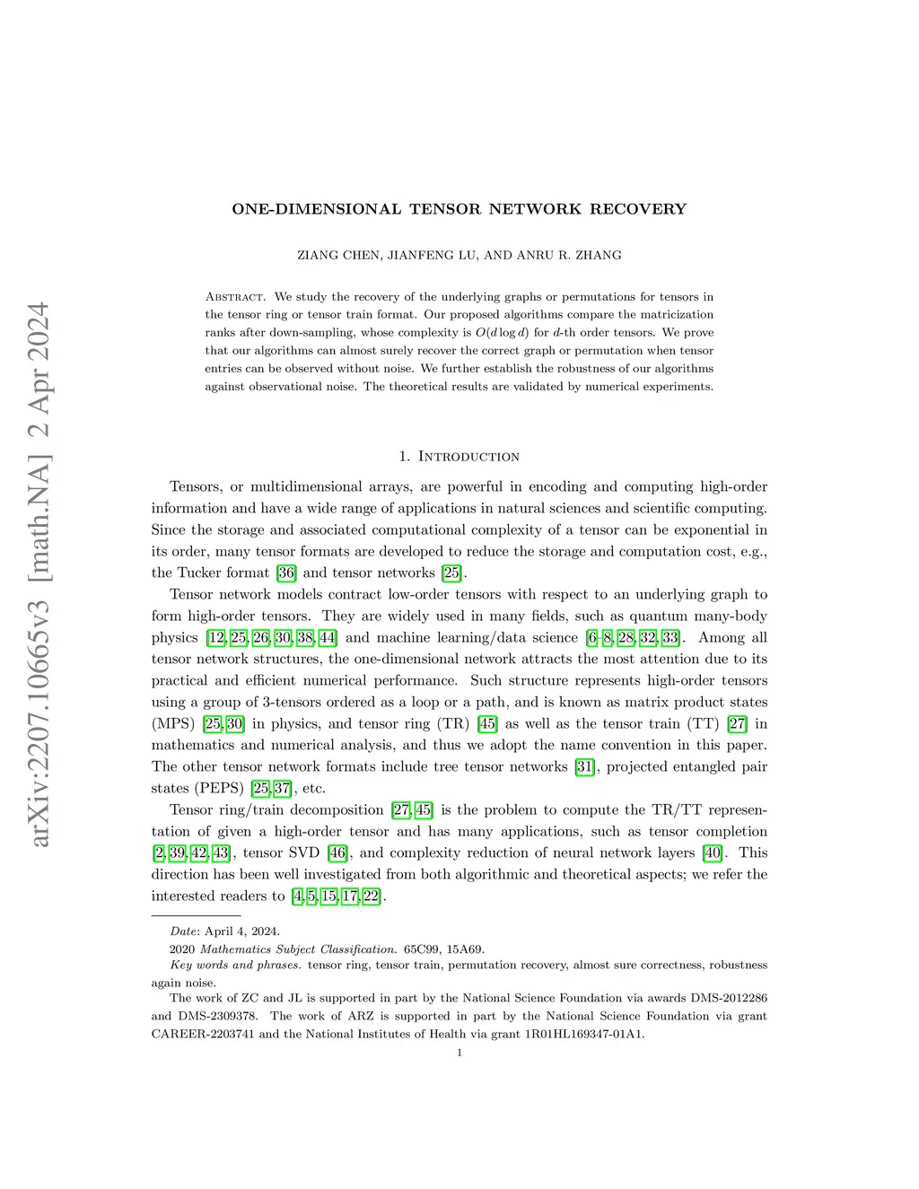 We study the recovery of the underlying graphs or permutations for tensors in the tensor ring or tensor train format. Our proposed algorithms compare the matricization ranks after down-sampling, whose complexity is for -th order tensors. We prove that our algorithms can almost surely recover the correct graph or permutation when tensor entries can be observed without noise. We further establish the robustness of our algorithms against observational noise. The theoretical results are validated by numerical experiments.