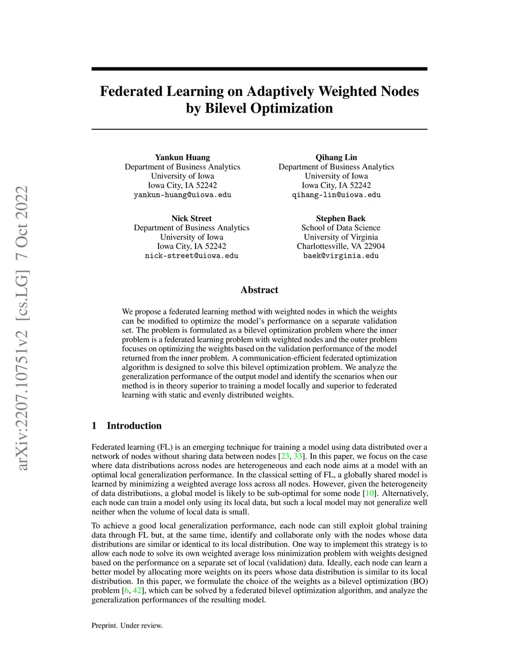 Federated Learning on Adaptively Weighted Nodes by Bilevel Optimization