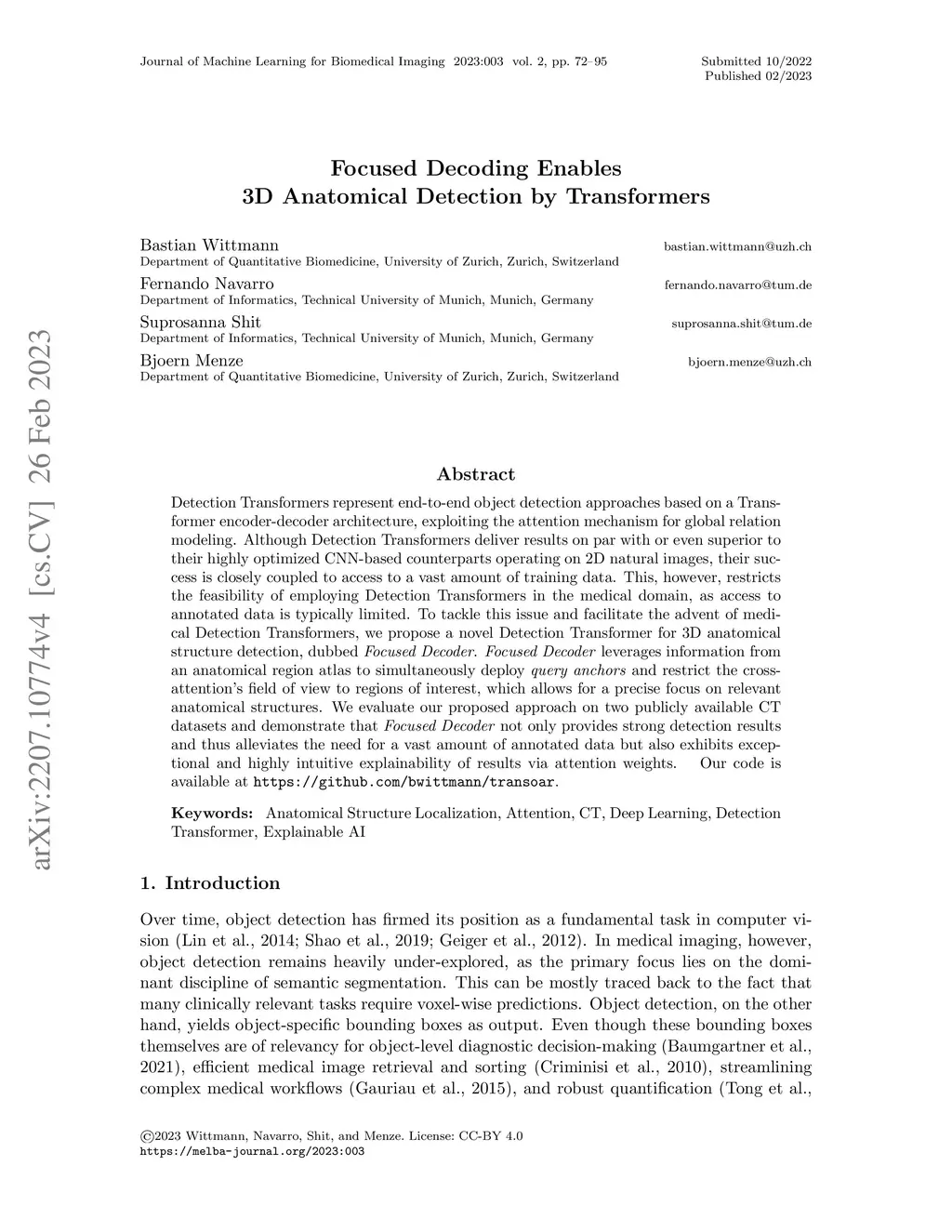 Detection Transformers represent end-to-end object detection approaches based on a Transformer encoder-decoder architecture, exploiting the attention mechanism for global relation modeling. Although Detection Transformers deliver results on par with or even superior to their highly optimized CNN-based counterparts operating on 2D natural images, their success is closely coupled to access to a vast amount of training data. This, however, restricts the feasibility of employing Detection Transformers in the medical domain, as access to annotated data is typically limited. To tackle this issue and facilitate the advent of medical Detection Transformers, we propose a novel Detection Transformer for 3D anatomical structure detection, dubbed Focused Decoder. Focused Decoder leverages information from an anatomical region atlas to simultaneously deploy query anchors and restrict the cross-attention's field of view to regions of interest, which allows for a precise focus on relevant anatomical structures. We evaluate our proposed approach on two publicly available CT datasets and demonstrate that Focused Decoder not only provides strong detection results and thus alleviates the need for a vast amount of annotated data but also exhibits exceptional and highly intuitive explainability of results via attention weights. Our code is available at https://github.com/bwittmann/transoar.