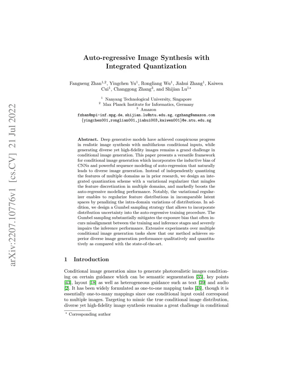Deep generative models have achieved conspicuous progress in realistic image synthesis with multifarious conditional inputs, while generating diverse yet high-fidelity images remains a grand challenge in conditional image generation. This paper presents a versatile framework for conditional image generation which incorporates the inductive bias of CNNs and powerful sequence modeling of auto-regression that naturally leads to diverse image generation. Instead of independently quantizing the features of multiple domains as in prior research, we design an integrated quantization scheme with a variational regularizer that mingles the feature discretization in multiple domains, and markedly boosts the auto-regressive modeling performance. Notably, the variational regularizer enables to regularize feature distributions in incomparable latent spaces by penalizing the intra-domain variations of distributions. In addition, we design a Gumbel sampling strategy that allows to incorporate distribution uncertainty into the auto-regressive training procedure. The Gumbel sampling substantially mitigates the exposure bias that often incurs misalignment between the training and inference stages and severely impairs the inference performance. Extensive experiments over multiple conditional image generation tasks show that our method achieves superior diverse image generation performance qualitatively and quantitatively as compared with the state-of-the-art.