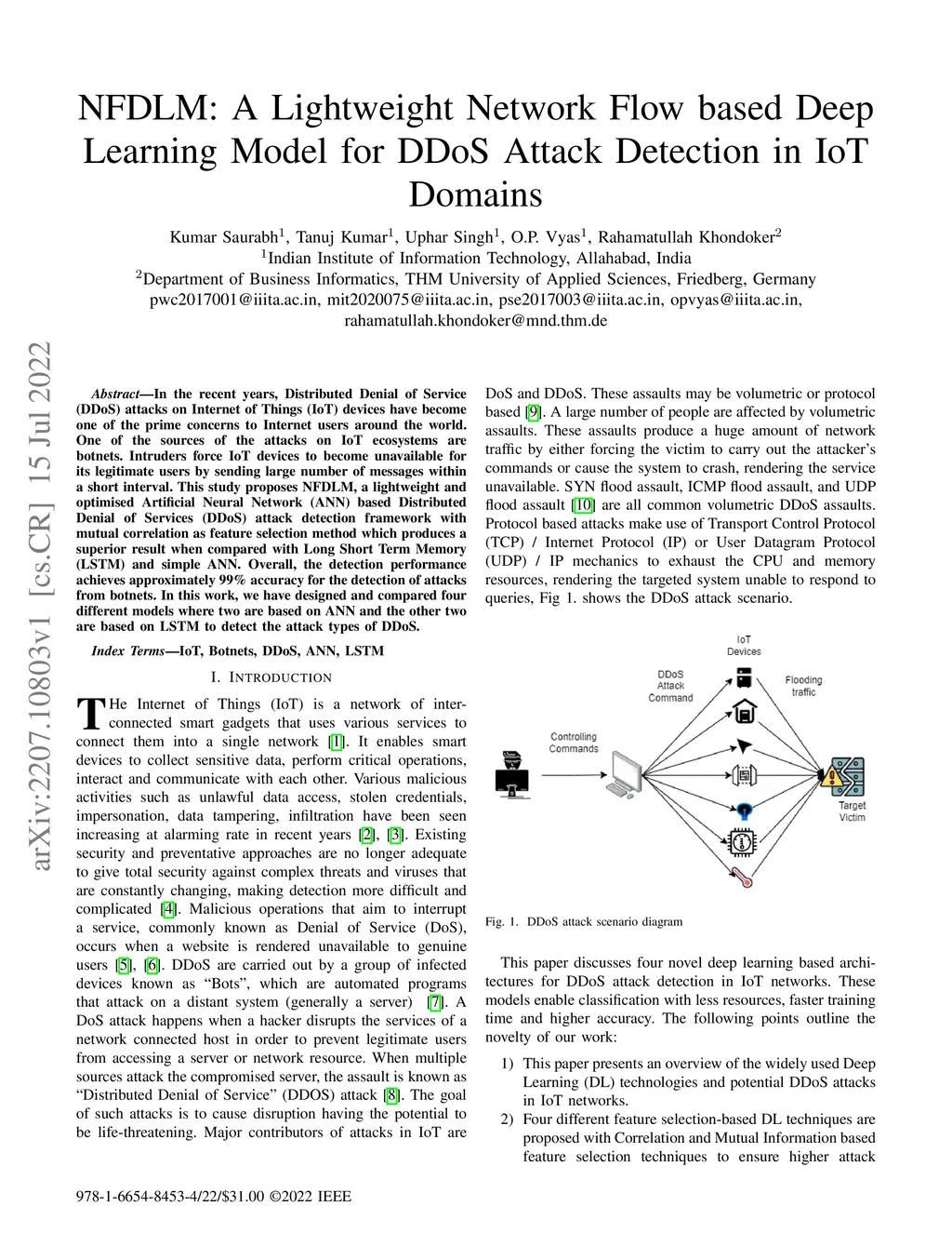 In the recent years, Distributed Denial of Service (DDoS) attacks on Internet of Things (IoT) devices have become one of the prime concerns to Internet users around the world. One of the sources of the attacks on IoT ecosystems are botnets. Intruders force IoT devices to become unavailable for its legitimate users by sending large number of messages within a short interval. This study proposes NFDLM, a lightweight and optimised Artificial Neural Network (ANN) based Distributed Denial of Services (DDoS) attack detection framework with mutual correlation as feature selection method which produces a superior result when compared with Long Short Term Memory (LSTM) and simple ANN. Overall, the detection performance achieves approximately 99\% accuracy for the detection of attacks from botnets. In this work, we have designed and compared four different models where two are based on ANN and the other two are based on LSTM to detect the attack types of DDoS.