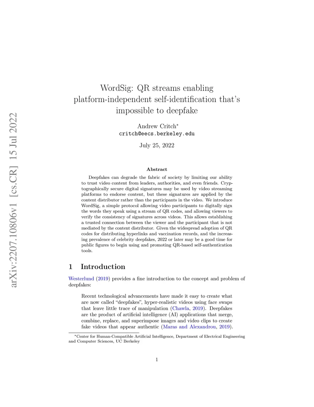 Deepfakes can degrade the fabric of society by limiting our ability to trust video content from leaders, authorities, and even friends. Cryptographically secure digital signatures may be used by video streaming platforms to endorse content, but these signatures are applied by the content distributor rather than the participants in the video. We introduce WordSig, a simple protocol allowing video participants to digitally sign the words they speak using a stream of QR codes, and allowing viewers to verify the consistency of signatures across videos. This allows establishing a trusted connection between the viewer and the participant that is not mediated by the content distributor. Given the widespread adoption of QR codes for distributing hyperlinks and vaccination records, and the increasing prevalence of celebrity deepfakes, 2022 or later may be a good time for public figures to begin using and promoting QR-based self-authentication tools.