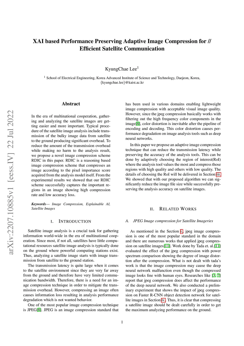 In the era of multinational cooperation, gathering and analyzing the satellite images are getting easier and more important. Typical procedure of the satellite image analysis include transmission of the bulky image data from satellite to the ground producing significant overhead. To reduce the amount of the transmission overhead while making no harm to the analysis result, we propose a novel image compression scheme RDIC in this paper. RDIC is a reasoning based image compression scheme that compresses an image according to the pixel importance score acquired from the analysis model itself. From the experimental results we showed that our RDIC scheme successfully captures the important regions in an image showing high compression rate and low accuracy loss.
