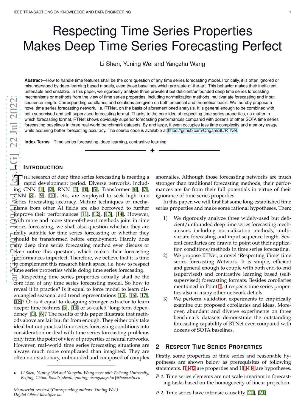 How to handle time features shall be the core question of any time series forecasting model. Ironically, it is often ignored or misunderstood by deep-learning based models, even those baselines which are state-of-the-art. This behavior makes their inefficient, untenable and unstable. In this paper, we rigorously analyze three prevalent but deficient/unfounded deep time series forecasting mechanisms or methods from the view of time series properties, including normalization methods, multivariate forecasting and input sequence length. Corresponding corollaries and solutions are given on both empirical and theoretical basis. We thereby propose a novel time series forecasting network, i.e. RTNet, on the basis of aforementioned analysis. It is general enough to be combined with both supervised and self-supervised forecasting format. Thanks to the core idea of respecting time series properties, no matter in which forecasting format, RTNet shows obviously superior forecasting performances compared with dozens of other SOTA time series forecasting baselines in three real-world benchmark datasets. By and large, it even occupies less time complexity and memory usage while acquiring better forecasting accuracy. The source code is available at https://github.com/OrigamiSL/RTNet.