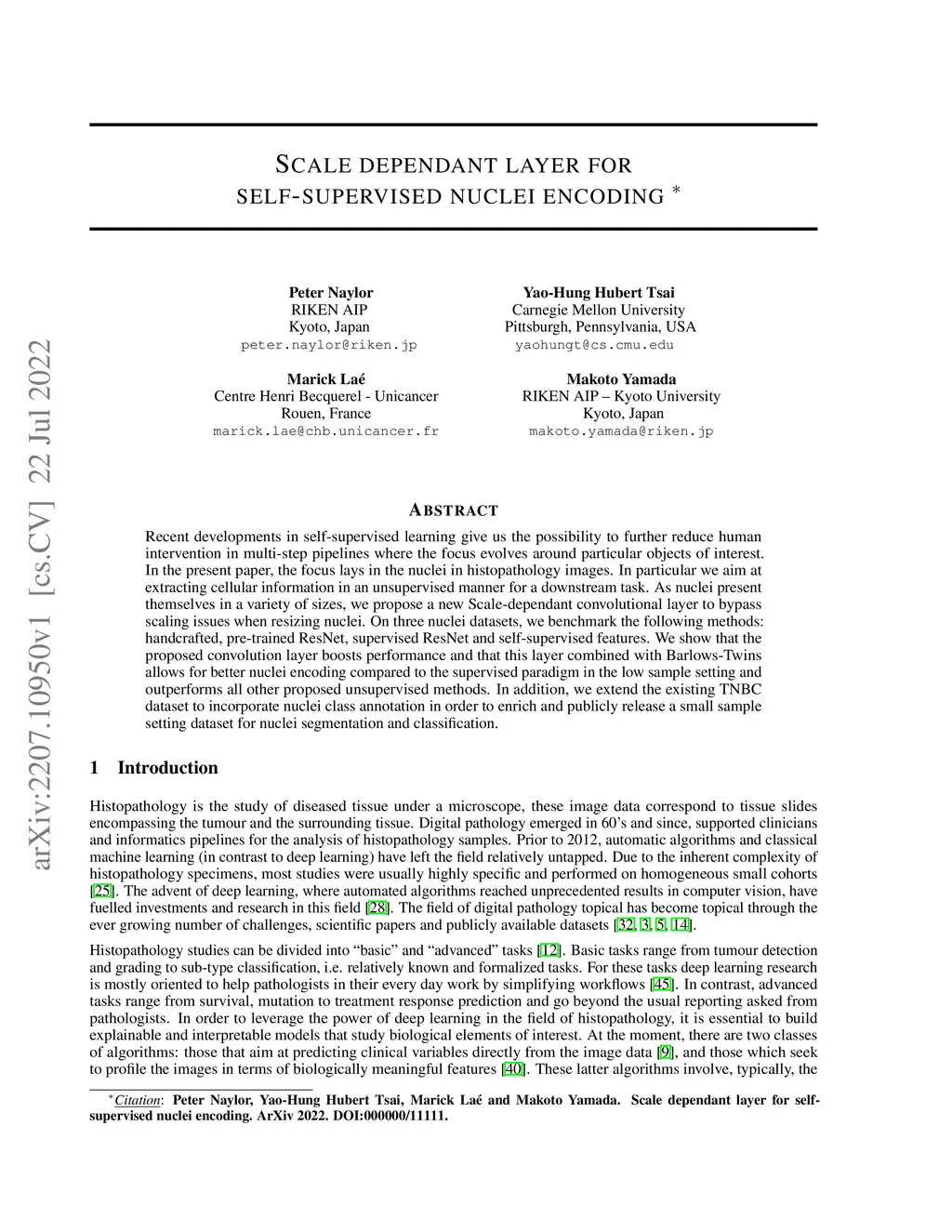 Recent developments in self-supervised learning give us the possibility to further reduce human intervention in multi-step pipelines where the focus evolves around particular objects of interest. In the present paper, the focus lays in the nuclei in histopathology images. In particular we aim at extracting cellular information in an unsupervised manner for a downstream task. As nuclei present themselves in a variety of sizes, we propose a new Scale-dependant convolutional layer to bypass scaling issues when resizing nuclei. On three nuclei datasets, we benchmark the following methods: handcrafted, pre-trained ResNet, supervised ResNet and self-supervised features. We show that the proposed convolution layer boosts performance and that this layer combined with Barlows-Twins allows for better nuclei encoding compared to the supervised paradigm in the low sample setting and outperforms all other proposed unsupervised methods. In addition, we extend the existing TNBC dataset to incorporate nuclei class annotation in order to enrich and publicly release a small sample setting dataset for nuclei segmentation and classification.
