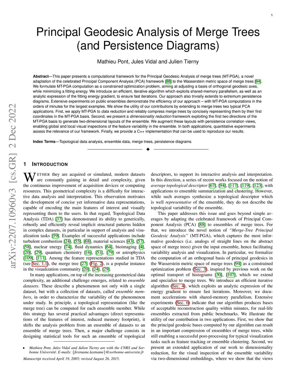 This paper presents a computational framework for the Principal Geodesic Analysis of merge trees (MT-PGA), a novel adaptation of the celebrated Principal Component Analysis (PCA) framework [87] to the Wasserstein metric space of merge trees [92]. We formulate MT-PGA computation as a constrained optimization problem, aiming at adjusting a basis of orthogonal geodesic axes, while minimizing a fitting energy. We introduce an efficient, iterative algorithm which exploits shared-memory parallelism, as well as an analytic expression of the fitting energy gradient, to ensure fast iterations. Our approach also trivially extends to extremum persistence diagrams. Extensive experiments on public ensembles demonstrate the efficiency of our approach - with MT-PGA computations in the orders of minutes for the largest examples. We show the utility of our contributions by extending to merge trees two typical PCA applications. First, we apply MT-PGA to data reduction and reliably compress merge trees by concisely representing them by their first coordinates in the MT-PGA basis. Second, we present a dimensionality reduction framework exploiting the first two directions of the MT-PGA basis to generate two-dimensional layouts of the ensemble. We augment these layouts with persistence correlation views, enabling global and local visual inspections of the feature variability in the ensemble. In both applications, quantitative experiments assess the relevance of our framework. Finally, we provide a C++ implementation that can be used to reproduce our results.
