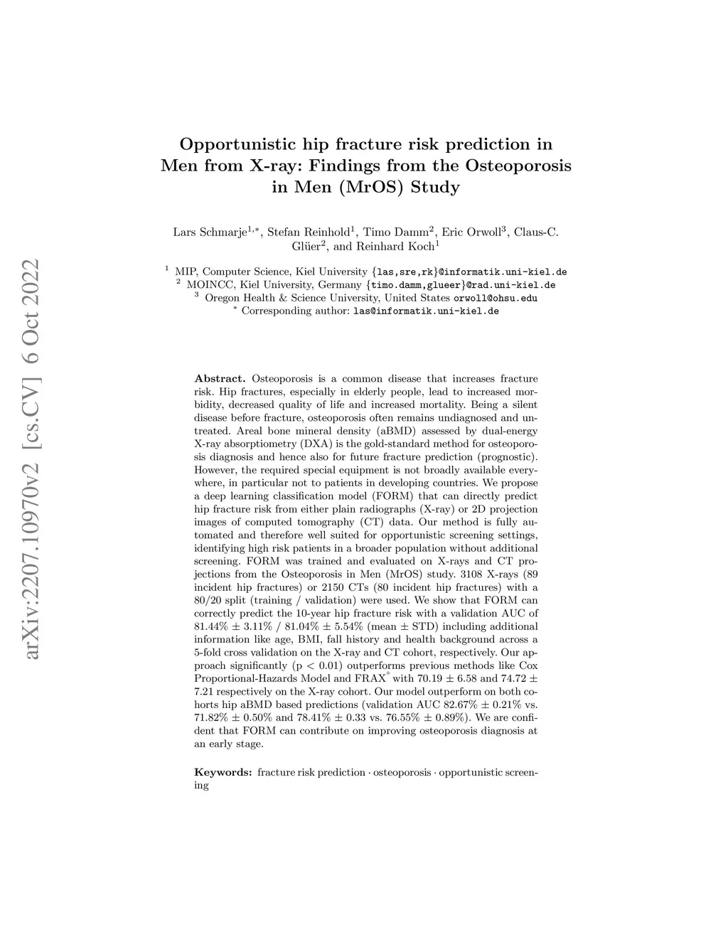 Osteoporosis is a common disease that increases fracture risk. Hip fractures, especially in elderly people, lead to increased morbidity, decreased quality of life and increased mortality. Being a silent disease before fracture, osteoporosis often remains undiagnosed and untreated. Areal bone mineral density (aBMD) assessed by dual-energy X-ray absorptiometry (DXA) is the gold-standard method for osteoporosis diagnosis and hence also for future fracture prediction (prognostic). However, the required special equipment is not broadly available everywhere, in particular not to patients in developing countries. We propose a deep learning classification model (FORM) that can directly predict hip fracture risk from either plain radiographs (X-ray) or 2D projection images of computed tomography (CT) data. Our method is fully automated and therefore well suited for opportunistic screening settings, identifying high risk patients in a broader population without additional screening. FORM was trained and evaluated on X-rays and CT projections from the Osteoporosis in Men (MrOS) study. 3108 X-rays (89 incident hip fractures) or 2150 CTs (80 incident hip fractures) with a 80/20 split were used. We show that FORM can correctly predict the 10-year hip fracture risk with a validation AUC of 81.44 +- 3.11% / 81.04 +- 5.54% (mean +- STD) including additional information like age, BMI, fall history and health background across a 5-fold cross validation on the X-ray and CT cohort, respectively. Our approach significantly (p < 0.01) outperforms previous methods like Cox Proportional-Hazards Model and \frax with 70.19 +- 6.58 and 74.72 +- 7.21 respectively on the X-ray cohort. Our model outperform on both cohorts hip aBMD based predictions. We are confident that FORM can contribute on improving osteoporosis diagnosis at an early stage.