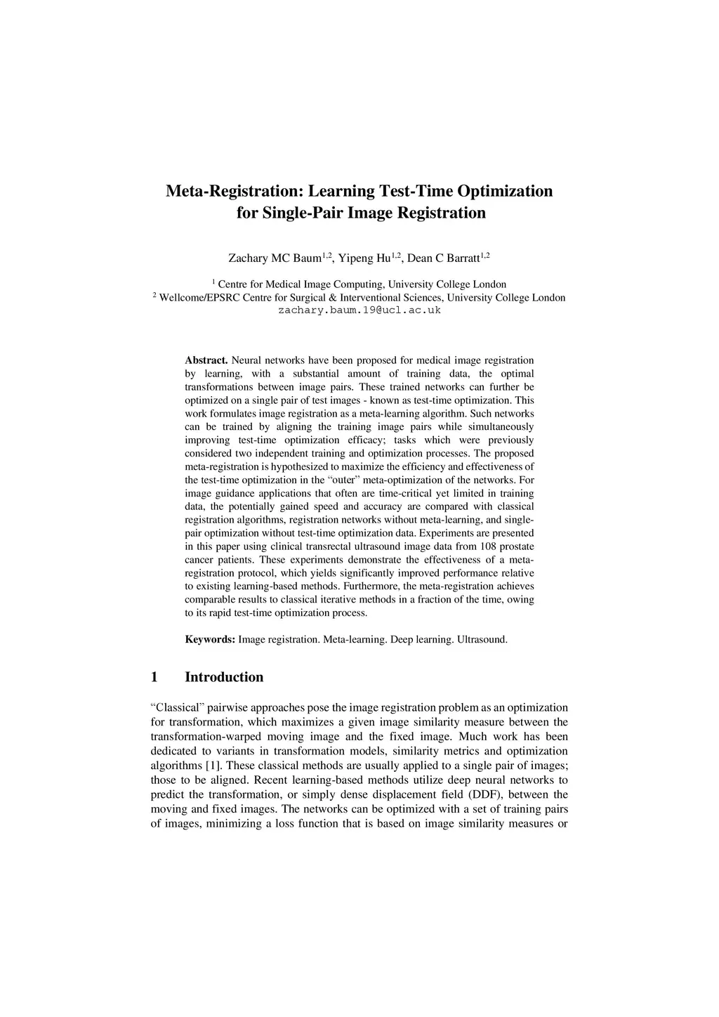 Neural networks have been proposed for medical image registration by learning, with a substantial amount of training data, the optimal transformations between image pairs. These trained networks can further be optimized on a single pair of test images - known as test-time optimization. This work formulates image registration as a meta-learning algorithm. Such networks can be trained by aligning the training image pairs while simultaneously improving test-time optimization efficacy; tasks which were previously considered two independent training and optimization processes. The proposed meta-registration is hypothesized to maximize the efficiency and effectiveness of the test-time optimization in the "outer" meta-optimization of the networks. For image guidance applications that often are time-critical yet limited in training data, the potentially gained speed and accuracy are compared with classical registration algorithms, registration networks without meta-learning, and single-pair optimization without test-time optimization data. Experiments are presented in this paper using clinical transrectal ultrasound image data from 108 prostate cancer patients. These experiments demonstrate the effectiveness of a meta-registration protocol, which yields significantly improved performance relative to existing learning-based methods. Furthermore, the meta-registration achieves comparable results to classical iterative methods in a fraction of the time, owing to its rapid test-time optimization process.