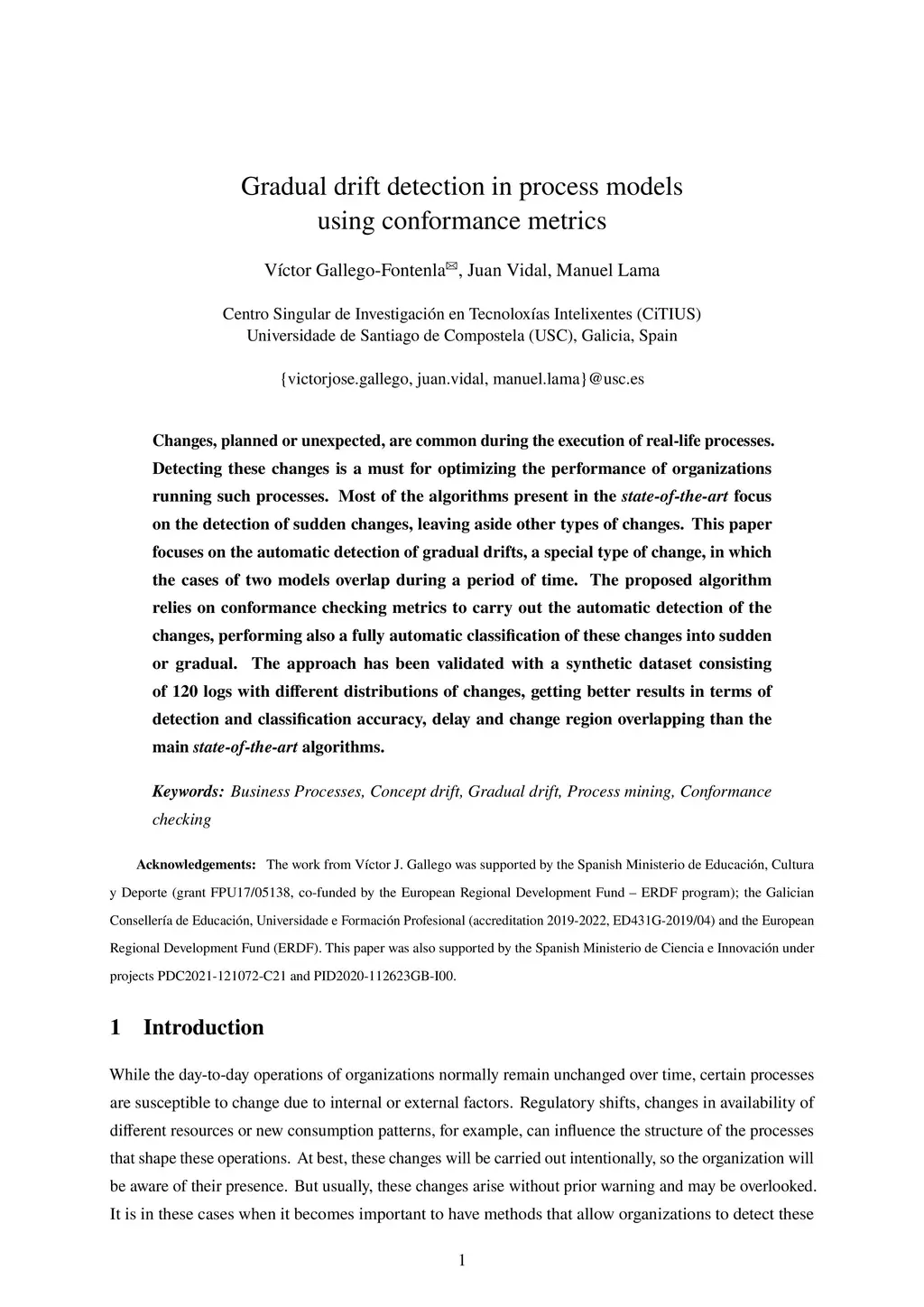 Changes, planned or unexpected, are common during the execution of real-life processes. Detecting these changes is a must for optimizing the performance of organizations running such processes. Most of the algorithms present in the state-of-the-art focus on the detection of sudden changes, leaving aside other types of changes. In this paper, we will focus on the automatic detection of gradual drifts, a special type of change, in which the cases of two models overlap during a period of time. The proposed algorithm relies on conformance checking metrics to carry out the automatic detection of the changes, performing also a fully automatic classification of these changes into sudden or gradual. The approach has been validated with a synthetic dataset consisting of 120 logs with different distributions of changes, getting better results in terms of detection and classification accuracy, delay and change region overlapping than the main state-of-the-art algorithms.