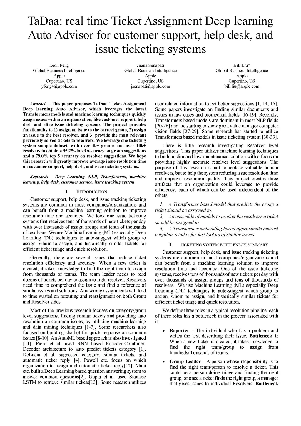 This paper proposes TaDaa: Ticket Assignment Deep learning Auto Advisor, which leverages the latest Transformers models and machine learning techniques quickly assign issues within an organization, like customer support, help desk and alike issue ticketing systems. The project provides functionality to 1) assign an issue to the correct group, 2) assign an issue to the best resolver, and 3) provide the most relevant previously solved tickets to resolvers. We leverage one ticketing system sample dataset, with over 3k+ groups and over 10k+ resolvers to obtain a 95.2% top 3 accuracy on group suggestions and a 79.0% top 5 accuracy on resolver suggestions. We hope this research will greatly improve average issue resolution time on customer support, help desk, and issue ticketing systems.