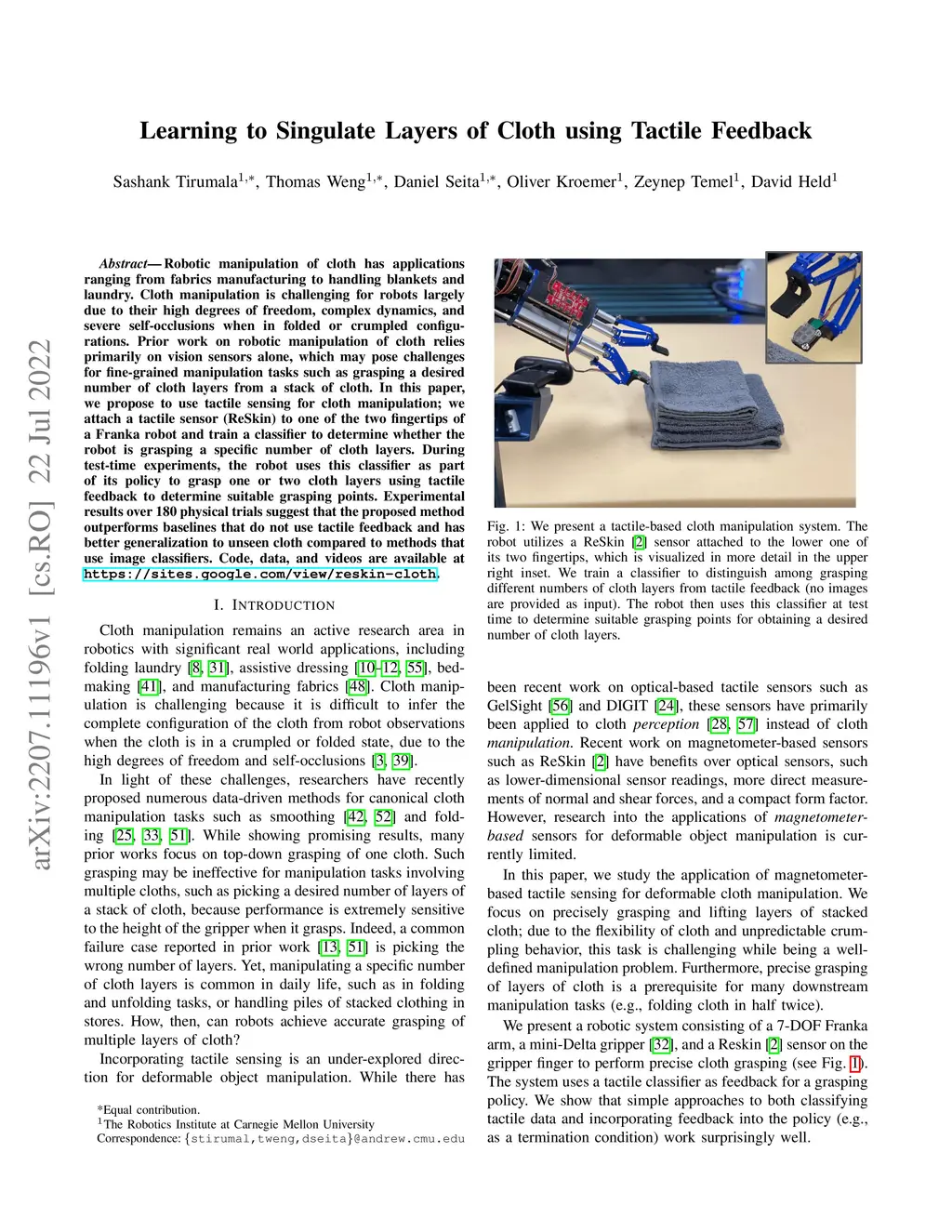 Learning to Singulate Layers of Cloth using Tactile Feedback