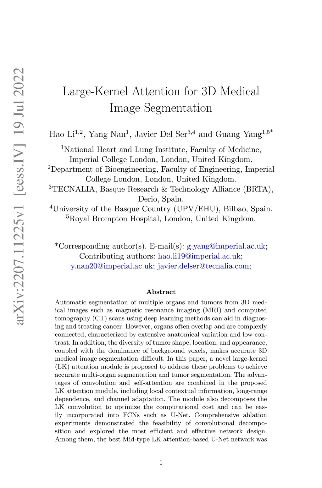 Automatic segmentation of multiple organs and tumors from 3D medical images such as magnetic resonance imaging (MRI) and computed tomography (CT) scans using deep learning methods can aid in diagnosing and treating cancer. However, organs often overlap and are complexly connected, characterized by extensive anatomical variation and low contrast. In addition, the diversity of tumor shape, location, and appearance, coupled with the dominance of background voxels, makes accurate 3D medical image segmentation difficult. In this paper, a novel large-kernel (LK) attention module is proposed to address these problems to achieve accurate multi-organ segmentation and tumor segmentation. The advantages of convolution and self-attention are combined in the proposed LK attention module, including local contextual information, long-range dependence, and channel adaptation. The module also decomposes the LK convolution to optimize the computational cost and can be easily incorporated into FCNs such as U-Net. Comprehensive ablation experiments demonstrated the feasibility of convolutional decomposition and explored the most efficient and effective network design. Among them, the best Mid-type LK attention-based U-Net network was evaluated on CT-ORG and BraTS 2020 datasets, achieving state-of-the-art segmentation performance. The performance improvement due to the proposed LK attention module was also statistically validated.