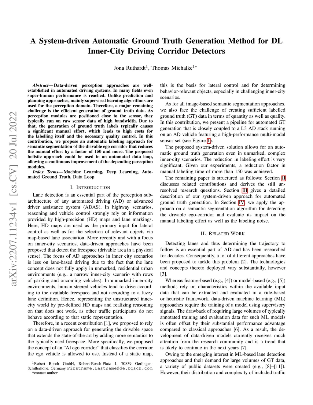 Data-driven perception approaches are well-established in automated driving systems. In many fields even super-human performance is reached. Unlike prediction and planning approaches, mainly supervised learning algorithms are used for the perception domain. Therefore, a major remaining challenge is the efficient generation of ground truth data. As perception modules are positioned close to the sensor, they typically run on raw sensor data of high bandwidth. Due to that, the generation of ground truth labels typically causes a significant manual effort, which leads to high costs for the labelling itself and the necessary quality control. In this contribution, we propose an automatic labeling approach for semantic segmentation of the drivable ego corridor that reduces the manual effort by a factor of 150 and more. The proposed holistic approach could be used in an automated data loop, allowing a continuous improvement of the depending perception modules.