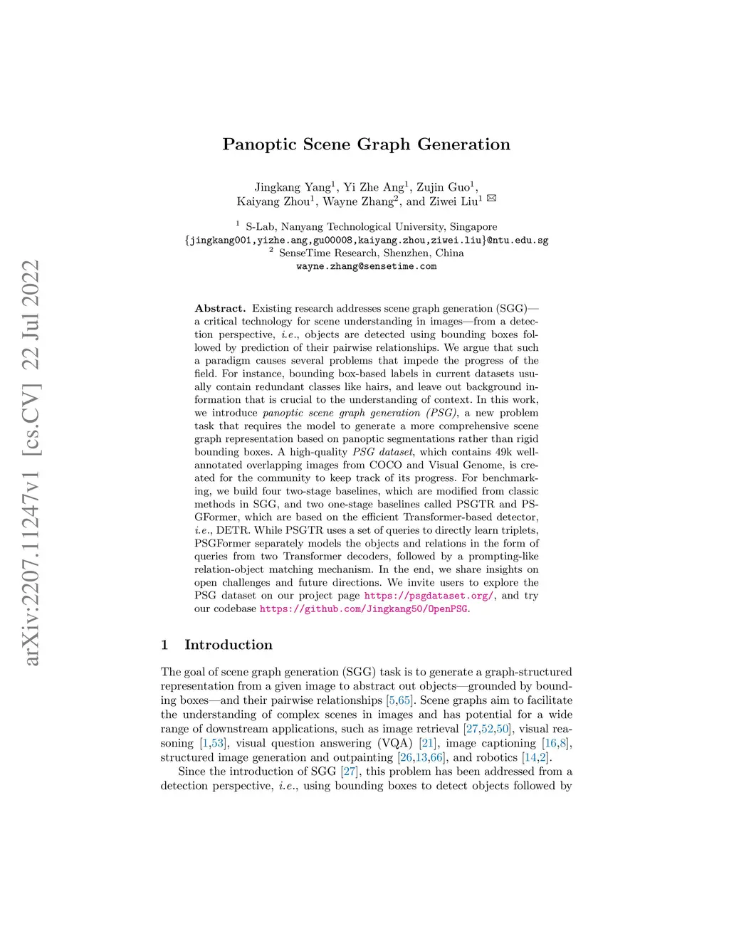 Existing research addresses scene graph generation (SGG) -- a critical technology for scene understanding in images -- from a detection perspective, i.e., objects are detected using bounding boxes followed by prediction of their pairwise relationships. We argue that such a paradigm causes several problems that impede the progress of the field. For instance, bounding box-based labels in current datasets usually contain redundant classes like hairs, and leave out background information that is crucial to the understanding of context. In this work, we introduce panoptic scene graph generation (PSG), a new problem task that requires the model to generate a more comprehensive scene graph representation based on panoptic segmentations rather than rigid bounding boxes. A high-quality PSG dataset, which contains 49k well-annotated overlapping images from COCO and Visual Genome, is created for the community to keep track of its progress. For benchmarking, we build four two-stage baselines, which are modified from classic methods in SGG, and two one-stage baselines called PSGTR and PSGFormer, which are based on the efficient Transformer-based detector, i.e., DETR. While PSGTR uses a set of queries to directly learn triplets, PSGFormer separately models the objects and relations in the form of queries from two Transformer decoders, followed by a prompting-like relation-object matching mechanism. In the end, we share insights on open challenges and future directions.