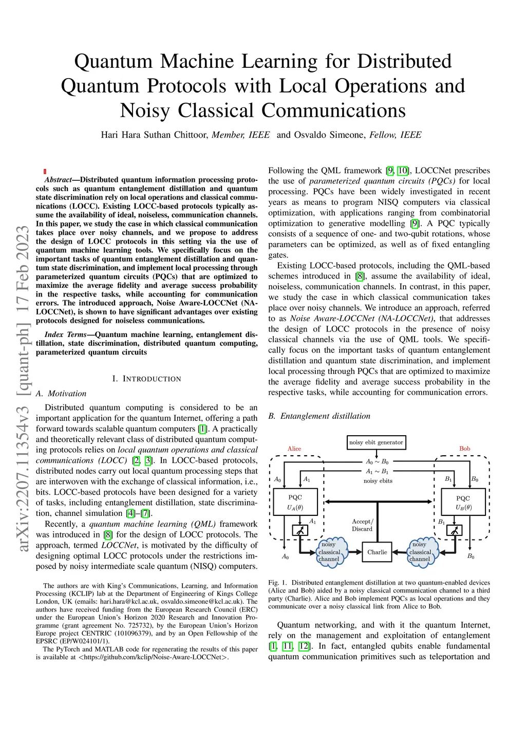 Distributed quantum information processing protocols such as quantum entanglement distillation and quantum state discrimination rely on local operations and classical communications (LOCC). Existing LOCC-based protocols typically assume the availability of ideal, noiseless, communication channels. In this paper, we study the case in which classical communication takes place over noisy channels, and we propose to address the design of LOCC protocols in this setting via the use of quantum machine learning tools. We specifically focus on the important tasks of quantum entanglement distillation and quantum state discrimination, and implement local processing through parameterized quantum circuits (PQCs) that are optimized to maximize the average fidelity and average success probability in the respective tasks, while accounting for communication errors. The introduced approach, Noise Aware-LOCCNet (NA-LOCCNet), is shown to have significant advantages over existing protocols designed for noiseless communications.