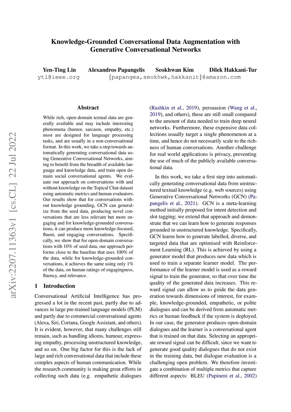 While rich, open-domain textual data are generally available and may include interesting phenomena (humor, sarcasm, empathy, etc.) most are designed for language processing tasks, and are usually in a non-conversational format. In this work, we take a step towards automatically generating conversational data using Generative Conversational Networks, aiming to benefit from the breadth of available language and knowledge data, and train open domain social conversational agents. We evaluate our approach on conversations with and without knowledge on the Topical Chat dataset using automatic metrics and human evaluators. Our results show that for conversations without knowledge grounding, GCN can generalize from the seed data, producing novel conversations that are less relevant but more engaging and for knowledge-grounded conversations, it can produce more knowledge-focused, fluent, and engaging conversations. Specifically, we show that for open-domain conversations with 10\% of seed data, our approach performs close to the baseline that uses 100% of the data, while for knowledge-grounded conversations, it achieves the same using only 1% of the data, on human ratings of engagingness, fluency, and relevance.