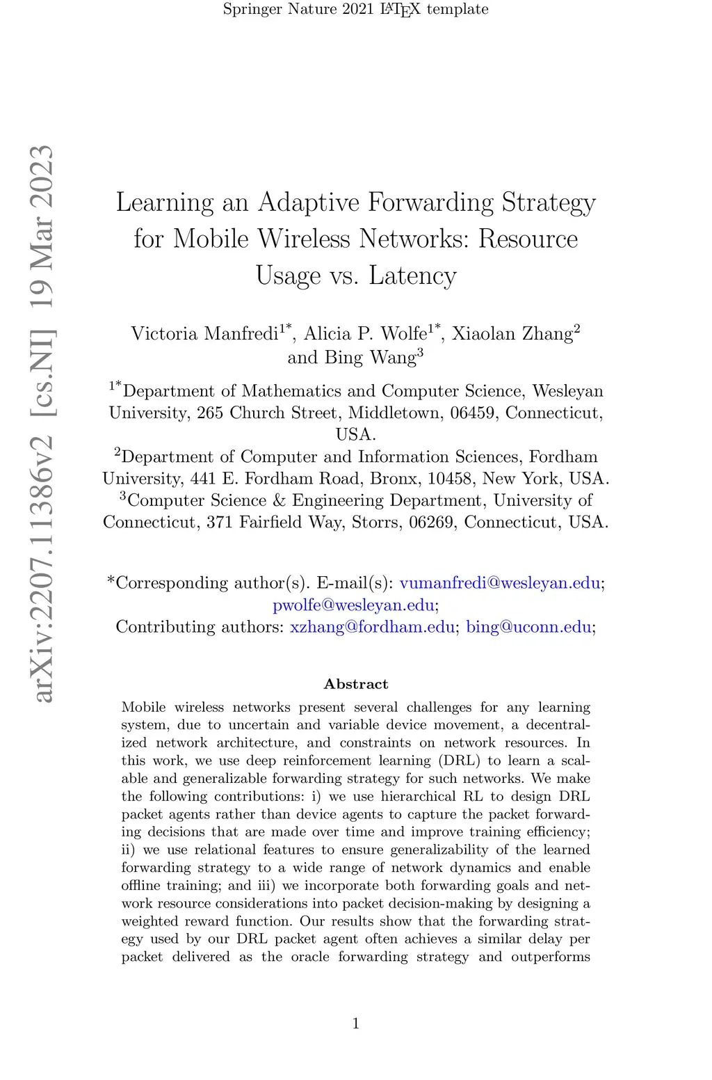 Learning an Adaptive Forwarding Strategy for Mobile Wireless Networks: