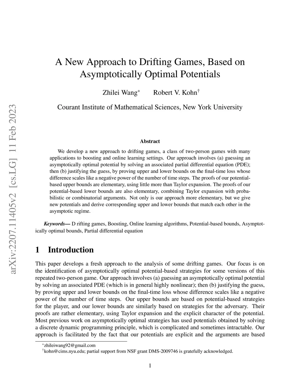 We develop a new approach to drifting games, a class of two-person games with many applications to boosting and online learning settings. Our approach involves (a) guessing an asymptotically optimal potential by solving an associated partial differential equation (PDE); then (b) justifying the guess, by proving upper and lower bounds on the final-time loss whose difference scales like a negative power of the number of time steps. The proofs of our potential-based upper bounds are elementary, using little more than Taylor expansion. The proofs of our potential-based lower bounds are also elementary, combining Taylor expansion with probabilistic or combinatorial arguments. Not only is our approach more elementary, but we give new potentials and derive corresponding upper and lower bounds that match each other in the asymptotic regime.