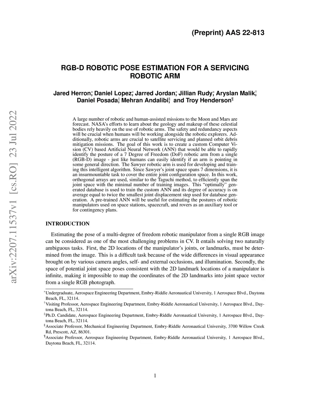 RGB-D Robotic Pose Estimation For a Servicing Robotic Arm