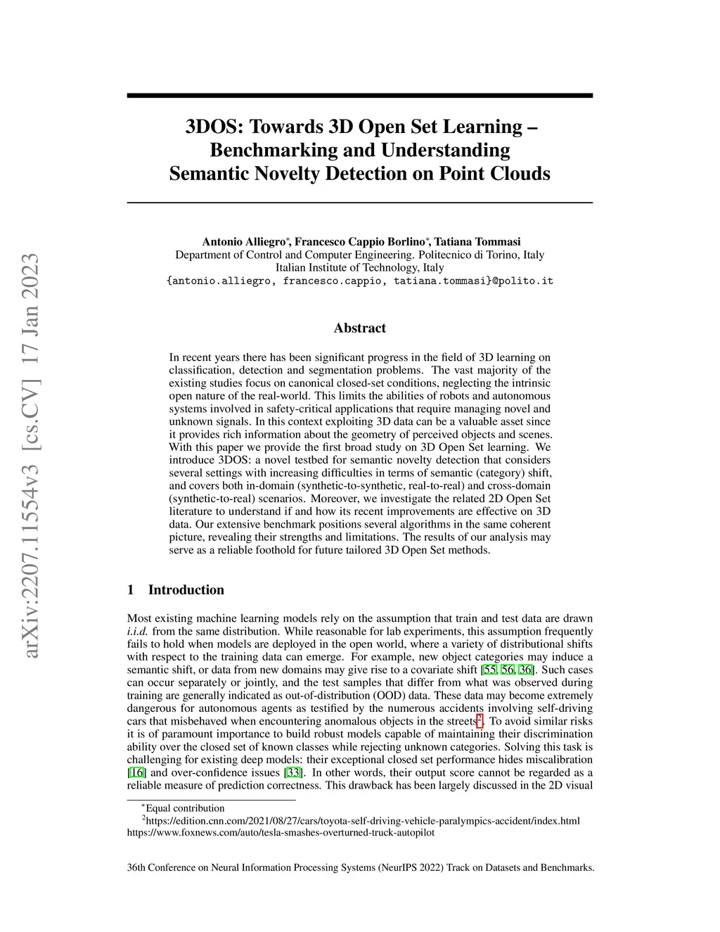 In recent years there has been significant progress in the field of 3D learning on classification, detection and segmentation problems. The vast majority of the existing studies focus on canonical closed-set conditions, neglecting the intrinsic open nature of the real-world. This limits the abilities of robots and autonomous systems involved in safety-critical applications that require managing novel and unknown signals. In this context exploiting 3D data can be a valuable asset since it provides rich information about the geometry of perceived objects and scenes. With this paper we provide the first broad study on 3D Open Set learning. We introduce 3DOS: a novel testbed for semantic novelty detection that considers several settings with increasing difficulties in terms of semantic (category) shift, and covers both in-domain (synthetic-to-synthetic, real-to-real) and cross-domain (synthetic-to-real) scenarios. Moreover, we investigate the related 2D Open Set literature to understand if and how its recent improvements are effective on 3D data. Our extensive benchmark positions several algorithms in the same coherent picture, revealing their strengths and limitations. The results of our analysis may serve as a reliable foothold for future tailored 3D Open Set methods.