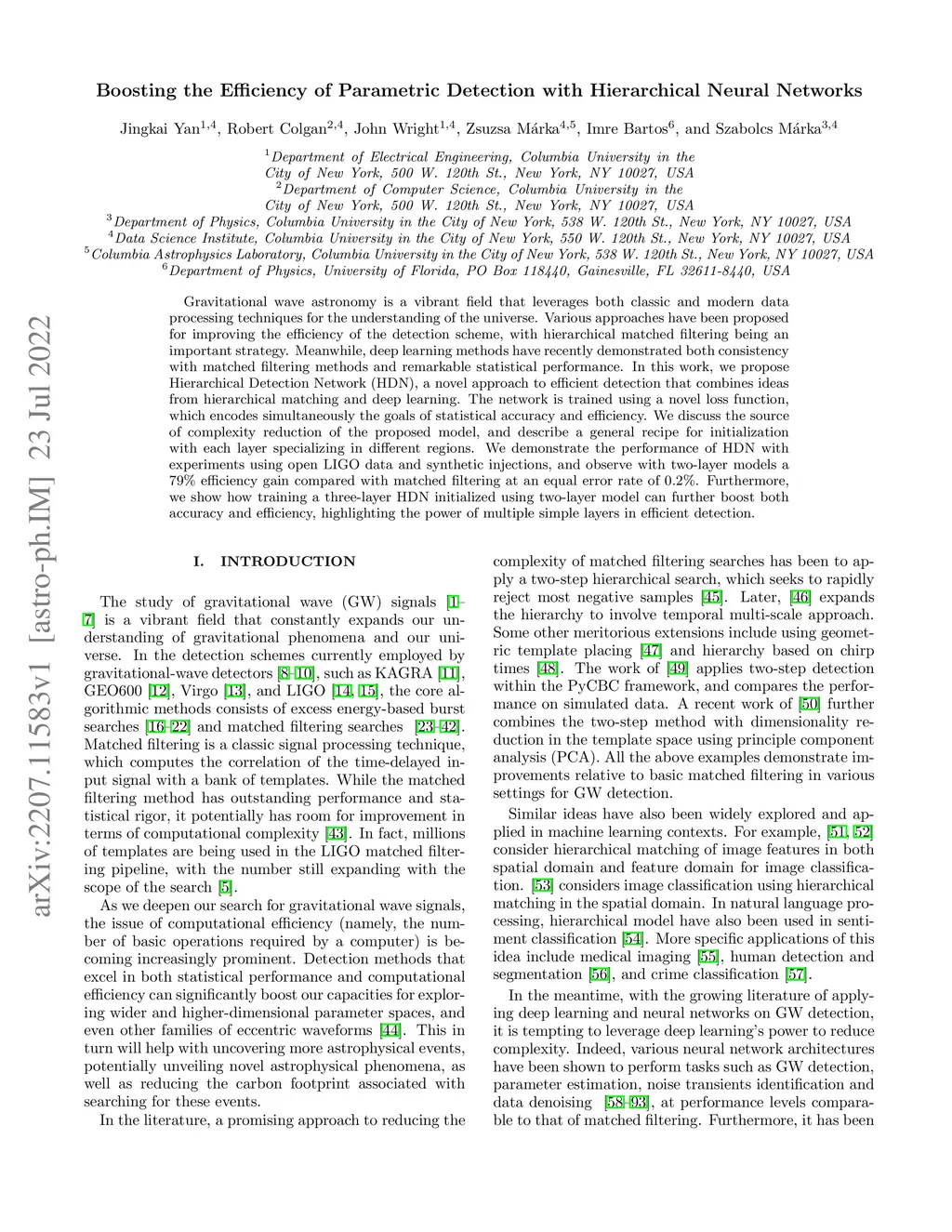 Gravitational wave astronomy is a vibrant field that leverages both classic and modern data processing techniques for the understanding of the universe. Various approaches have been proposed for improving the efficiency of the detection scheme, with hierarchical matched filtering being an important strategy. Meanwhile, deep learning methods have recently demonstrated both consistency with matched filtering methods and remarkable statistical performance. In this work, we propose Hierarchical Detection Network (HDN), a novel approach to efficient detection that combines ideas from hierarchical matching and deep learning. The network is trained using a novel loss function, which encodes simultaneously the goals of statistical accuracy and efficiency. We discuss the source of complexity reduction of the proposed model, and describe a general recipe for initialization with each layer specializing in different regions. We demonstrate the performance of HDN with experiments using open LIGO data and synthetic injections, and observe with two-layer models a efficiency gain compared with matched filtering at an equal error rate of . Furthermore, we show how training a three-layer HDN initialized using two-layer model can further boost both accuracy and efficiency, highlighting the power of multiple simple layers in efficient detection.