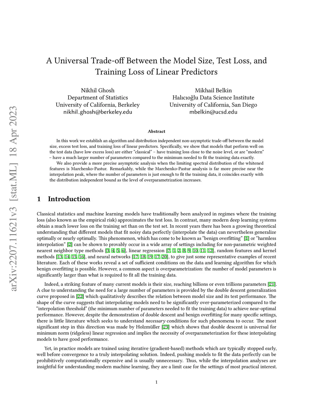 In this work we establish an algorithm and distribution independent non-asymptotic trade-off between the model size, excess test loss, and training loss of linear predictors. Specifically, we show that models that perform well on the test data (have low excess loss) are either "classical" -- have training loss close to the noise level, or are "modern" -- have a much larger number of parameters compared to the minimum needed to fit the training data exactly. We also provide a more precise asymptotic analysis when the limiting spectral distribution of the whitened features is Marchenko-Pastur. Remarkably, while the Marchenko-Pastur analysis is far more precise near the interpolation peak, where the number of parameters is just enough to fit the training data, it coincides exactly with the distribution independent bound as the level of overparametrization increases.