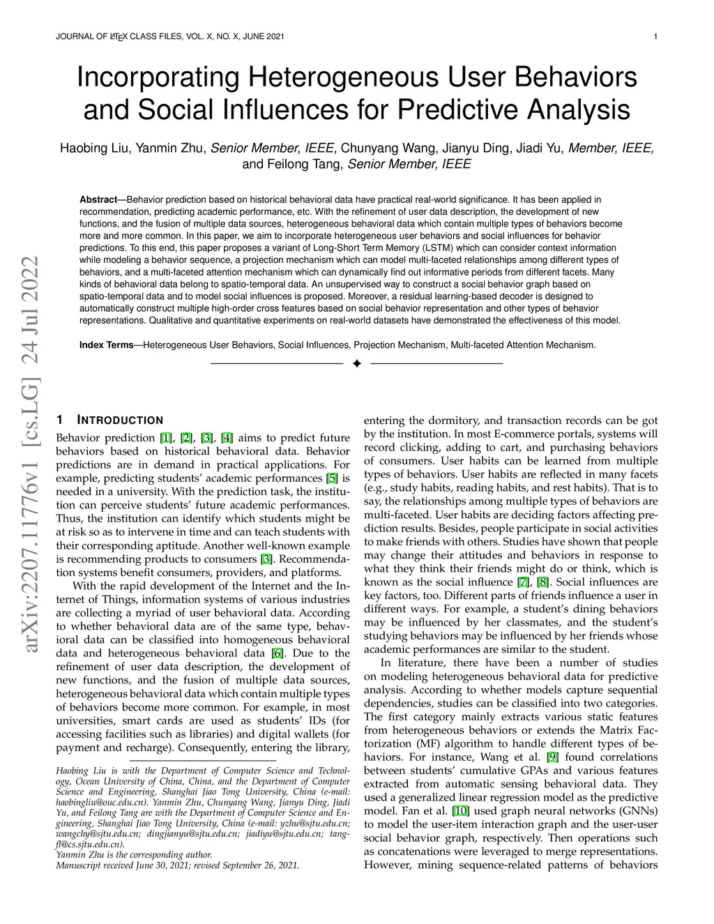 Behavior prediction based on historical behavioral data have practical real-world significance. It has been applied in recommendation, predicting academic performance, etc. With the refinement of user data description, the development of new functions, and the fusion of multiple data sources, heterogeneous behavioral data which contain multiple types of behaviors become more and more common. In this paper, we aim to incorporate heterogeneous user behaviors and social influences for behavior predictions. To this end, this paper proposes a variant of Long-Short Term Memory (LSTM) which can consider context information while modeling a behavior sequence, a projection mechanism which can model multi-faceted relationships among different types of behaviors, and a multi-faceted attention mechanism which can dynamically find out informative periods from different facets. Many kinds of behavioral data belong to spatio-temporal data. An unsupervised way to construct a social behavior graph based on spatio-temporal data and to model social influences is proposed. Moreover, a residual learning-based decoder is designed to automatically construct multiple high-order cross features based on social behavior representation and other types of behavior representations. Qualitative and quantitative experiments on real-world datasets have demonstrated the effectiveness of this model.